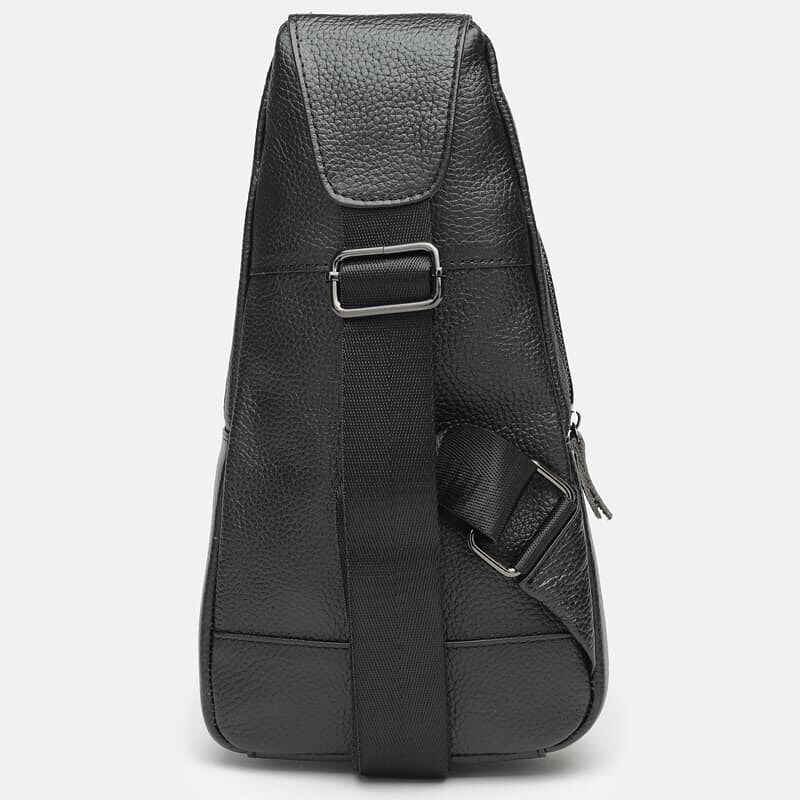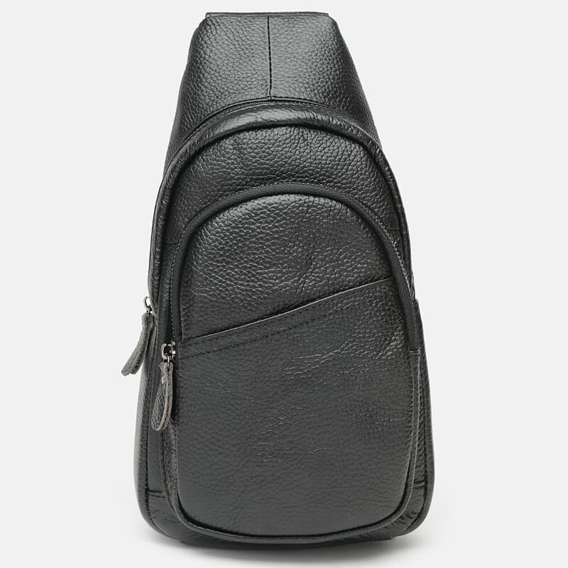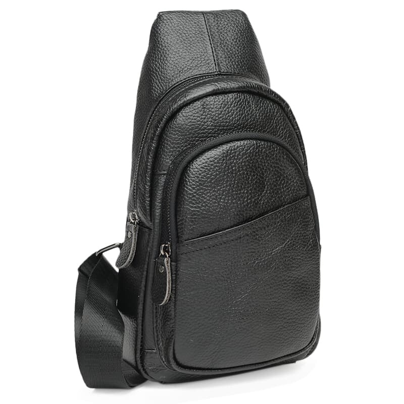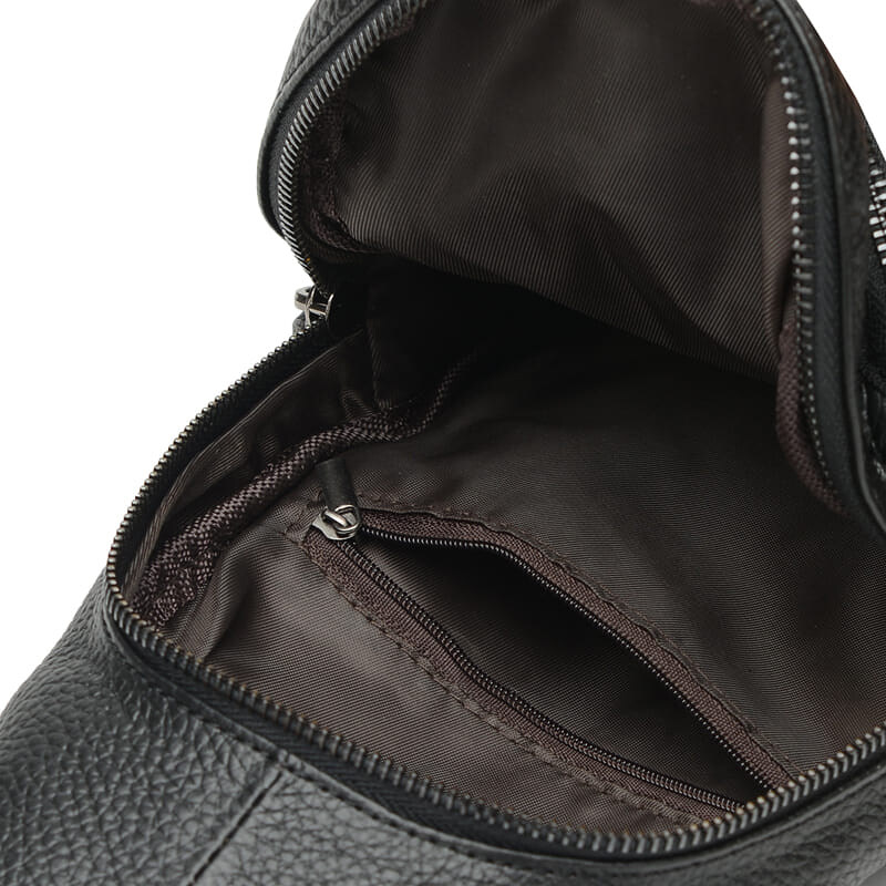 Рюкзак через плече виконаний з натуральної шкіри. Закривається на блискавку. Має 1 основне відділення. Усередині 1 кишеня на блискавці. Зовні -1 кишеню на блискавки і 1 накладної кишеньку. Підкладка-текстиль. Колір фурнітури-срібло. Плечовий ремінь регулюється по довжині.