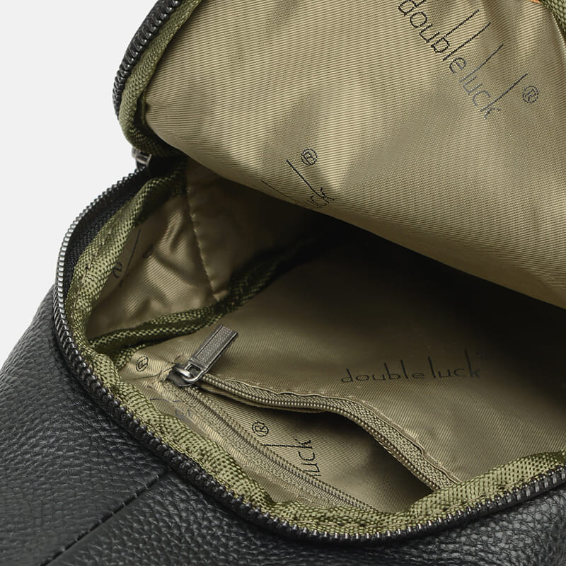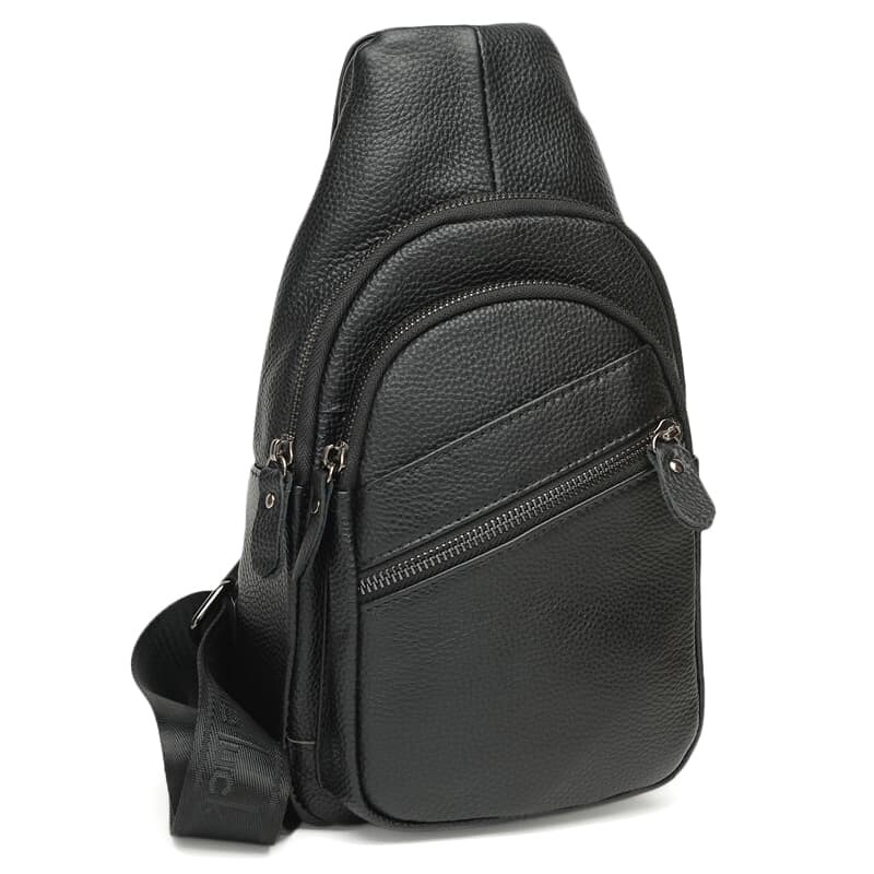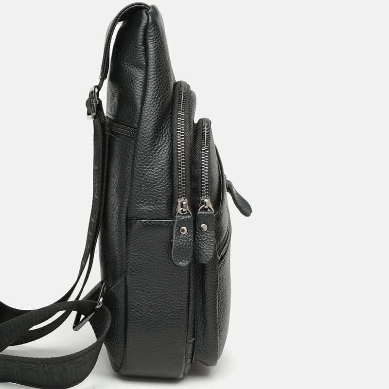 Рюкзак через плече з натуральної шкіри. Закривається на блискавку. Має 1 основне відділення. Усередині 1 кишеня на блискавці. Зовні -3 кишені на блискавці. Підкладка-текстиль. Колір фурнітури-срібло. Плечовий ремінь регулюється по довжині.