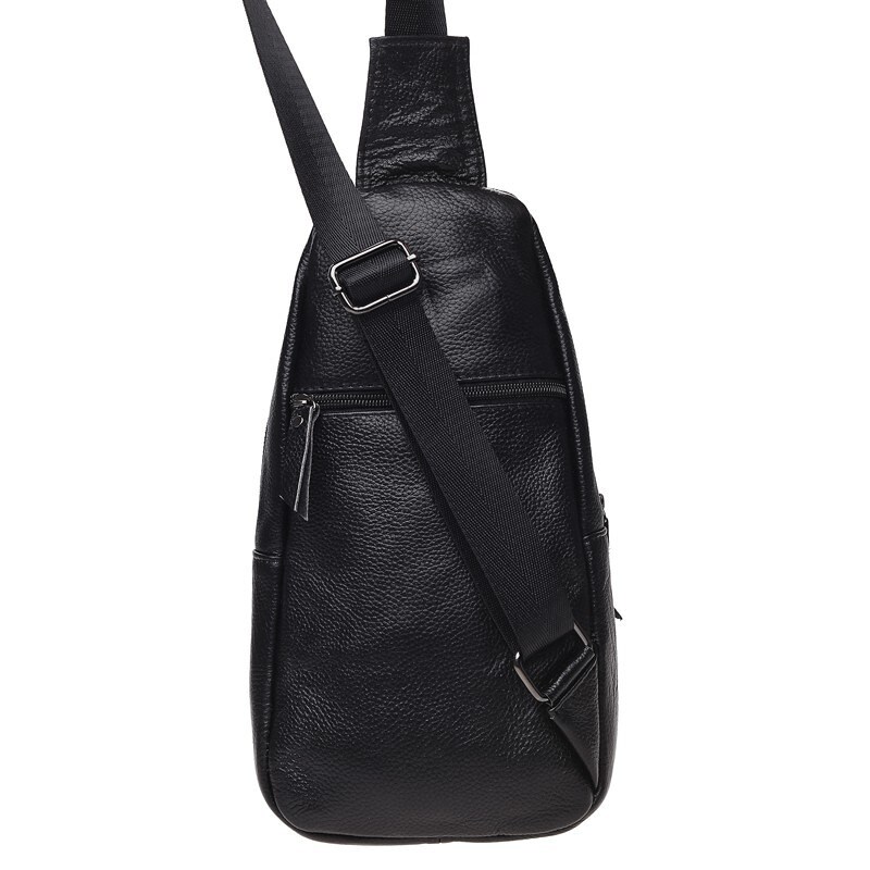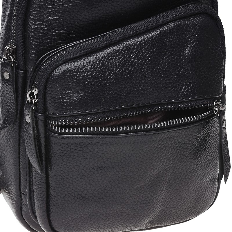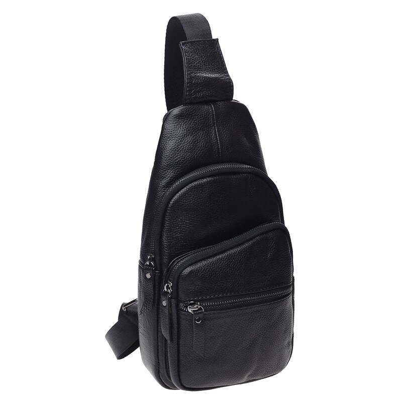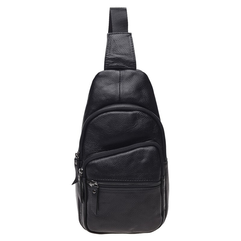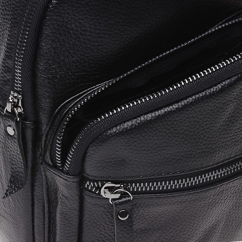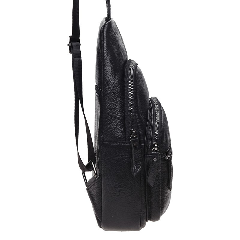 Рюкзак через плече-модний і практичний варіант для чоловіка на кожен день. Має 1 основне відділення на блискавці і 2 кишені всередині для дрібниць. Зовні-3 кишені на блискавці. Підкладка текстиль. Фурнітура- метал. Не'емний плечовий ремінь регулюється по довжині.