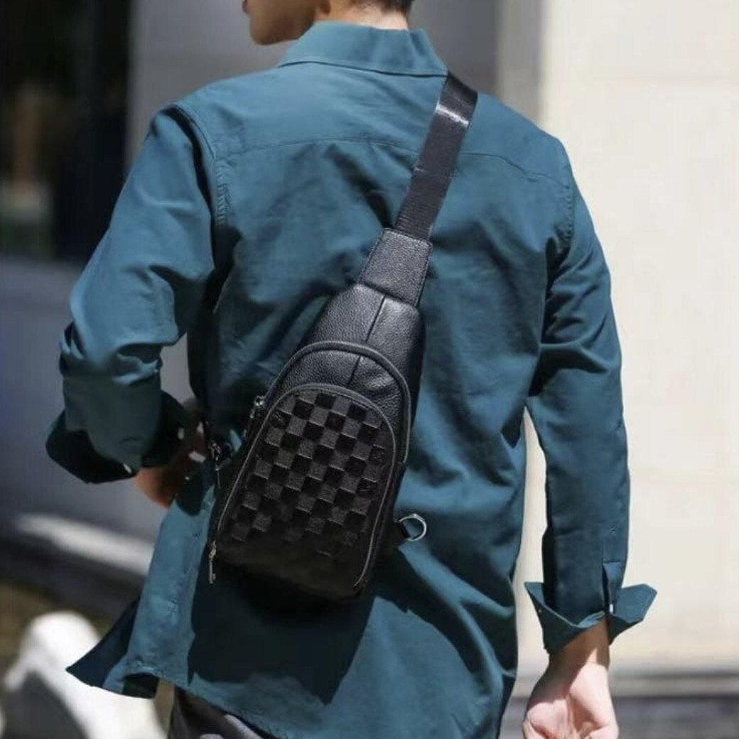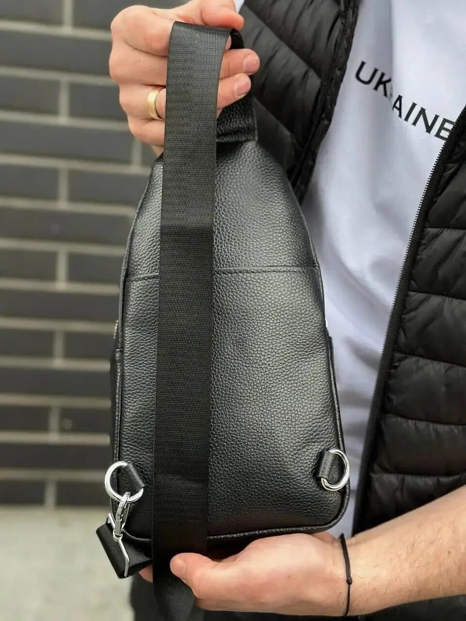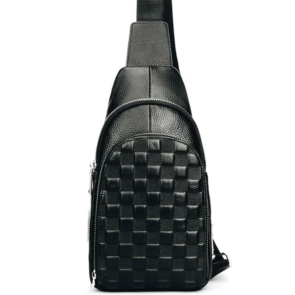 Чорний шкіряний слінг у зернистій шкірі. Якісний текстильний ремінь дозволяє зручно носити сумку.