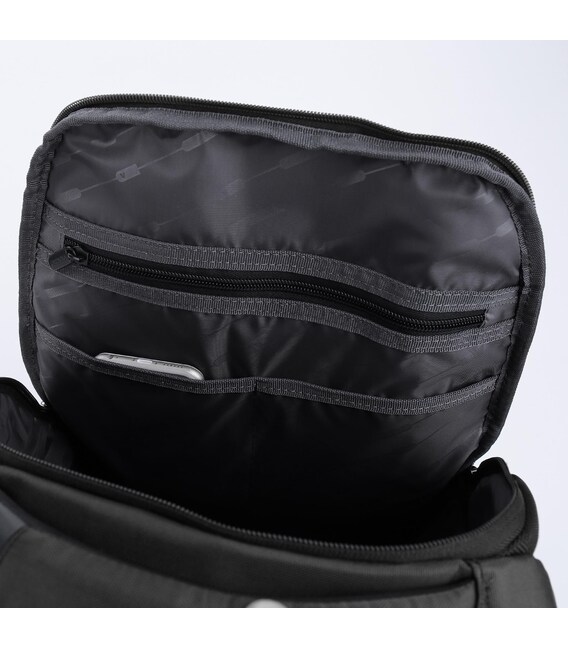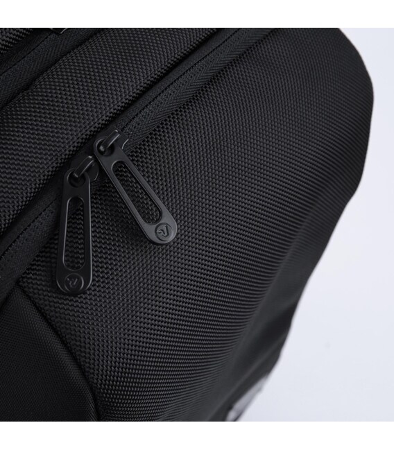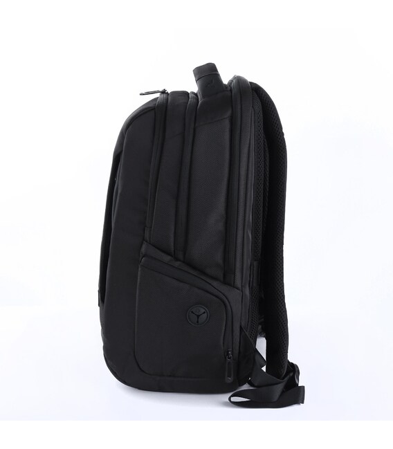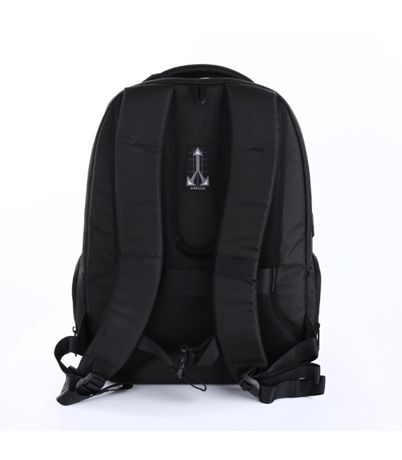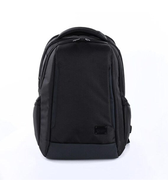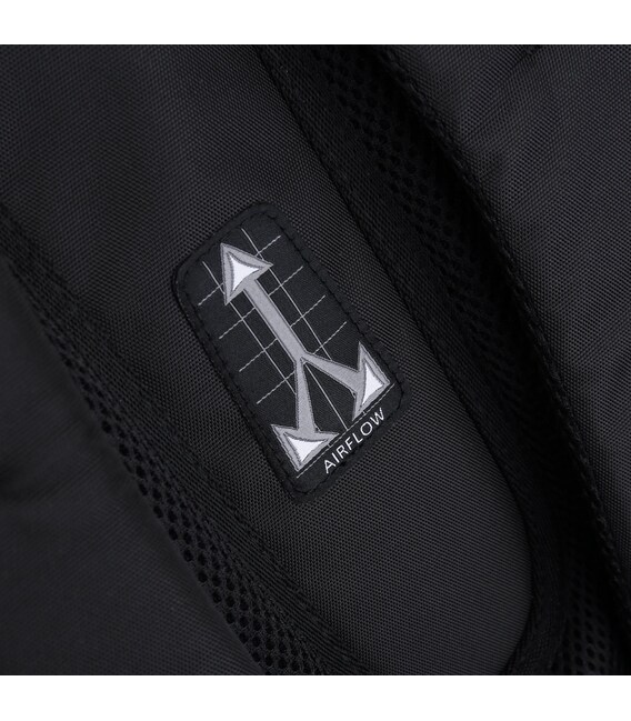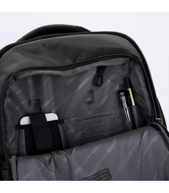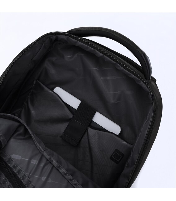 Даний рюкзак виготовлений з міцного матеріалу - нейлону і поліестеру, що забезпечує вологостійкість і стійкість до вигорання, а також довговічність у використанні. Задня поверхня рюкзака оснащена м'якою і комфортною спинкою, зручні плечові ремені мають можливість регулювання довжини. Зверху розташована переносна ручка. На фронтальній поверхні є вертикальна глибока прихована кишеня. Рюкзак має три відділення, які закриваються на блискавку. У першому розташований міні-офіс з відділеннями для карт, ручок, телефону. У другому і третьому - є спеціальні кишені для планшета з діагоналлю 10" і ноутбука 15,6". З боків рюкзака є дві невеликі кишені.