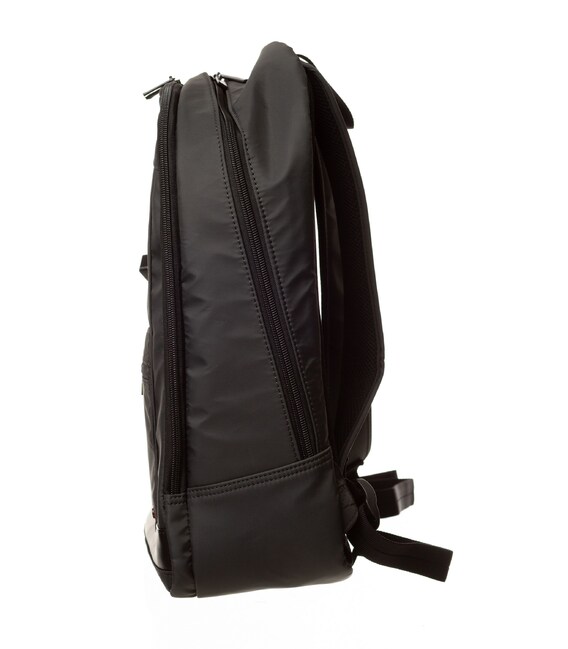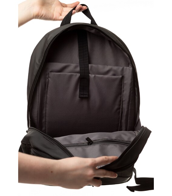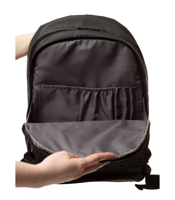 У рюкзака есть два отделения на молнии. В одном отделении со сдерживающими углами предусмотрен мини-офис. Второе отделение оснащено местом для ноутбука 13“ и планшета, есть глубокий карман на молнии.