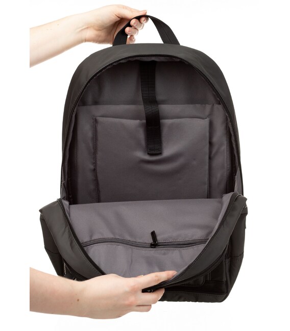 Городской рюкзак выполнен в классической форме. Он оснащен плечевыми ремнями с возможностью регулировки длины и подъемной ручкой сверху.