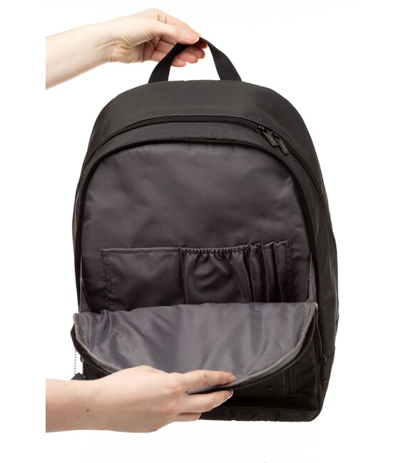 У рюкзака есть два отделения на молнии. В одном отделении со сдерживающими углами предусмотрен мини-офис. Второе отделение оснащено местом для ноутбука 15,6“ и планшета, есть глубокий карман на молнии.