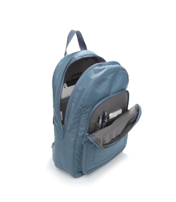 Городской рюкзак оснащен специальным местом для ноутбука 15" и планшета. На фронтальной поверхности расположен объемный карман на молнии с мини-офисом внутри, на нем еще один карман на молнии. На боковых поверхностях предусмотрены карманы на молнии со сдерживающими углами.