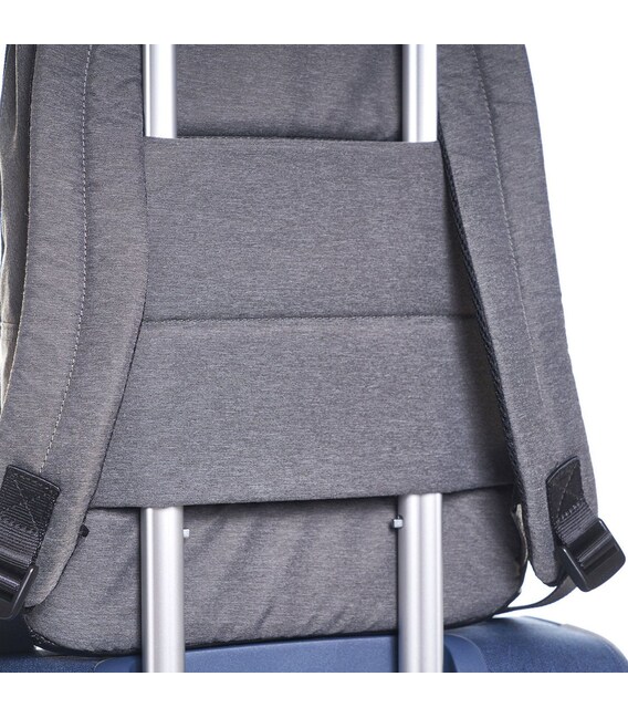 Аксессуар классической формы из прочной ткани с кожаной отделкой. Он оснащен мягкой комфортной спинкой для удобства, плечевыми ремнями с возможностью регулировки длины, подъемной ручкой сверху и текстильной планкой, за которую Вы можете спрятать плечевые ремни, или же использовать эту планку для крепления на чемодан.