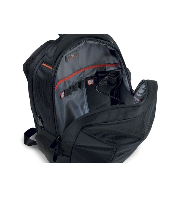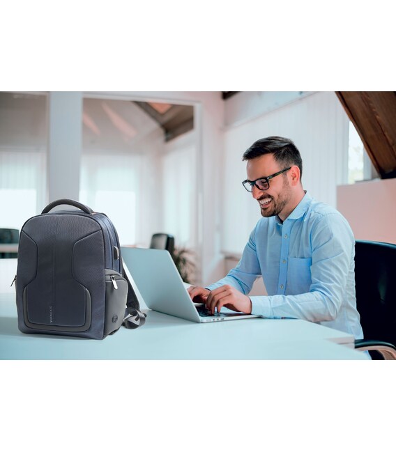 Рюкзак містить відділення з відсіками для ноутбука з діагоналлю 14,1" і планшета з діагоналлю 10". Виріб оснащений зручним USB-портом для заряджання особистих електронних пристроїв, роз'ємом для навушників, внутрішнім органайзером з нанесеними на нього значками для полегшення використання численних кишень і металевою застібкою-блискавкою з захисним замочком для відділення, призначеного для ноутбука. На задній панелі міститься прихована кишеня. Виготовлений рюкзак з міцного і зносостійкого матеріалу - поліестеру.