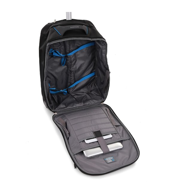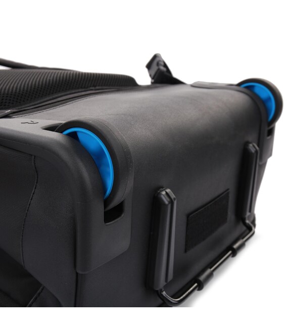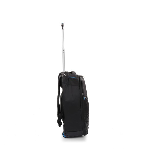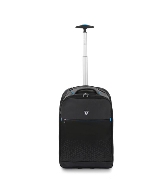 Рюкзак на колесах підходить для подорожей на нетривалий час. Виконаний з комбінованих тканин поліестеру/нейлон щільністю 600D, що дозволяє рюкзаку бути зносостійким і водовідштовхувальним. Оснащений основним відділенням з притискними ременями для речей і кишенями для електронних пристроїв з притискною стрічкою на липучці. Також присутні дві зовнішні кишені. Для зручності переміщення рюкзак оснащений двома вбудованими колесами з металевою підставкою для стійкості, регульованою телескопічною ручкою і м'якою ручкою для перенесення на верхній частині рюкзака.