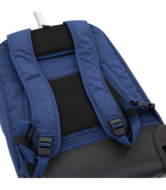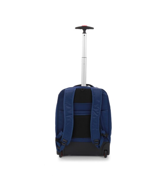 Рюкзак на колесах підходить для подорожей на нетривалий час. Виконаний з комбінованих тканин поліестеру/нейлон щільністю 600D, що дозволяє рюкзаку бути зносостійким і водовідштовхувальним. Оснащений основним відділенням з притискними ременями для речей і кишенями для електронних пристроїв з притискною стрічкою на липучці. Також присутні дві зовнішні кишені. Для зручності переміщення рюкзак оснащений двома вбудованими колесами з металевою підставкою для стійкості, регульованою телескопічною ручкою і м'якою ручкою для перенесення на верхній частині рюкзака.