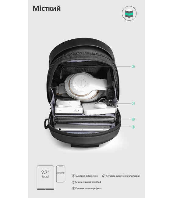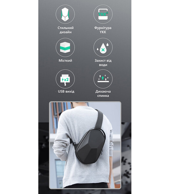 Особливість цієї сумки - в її ергономічному дизайні, який забезпечує максимальний комфорт під час використання. Широка регульована лямка дозволяє зручно носити сумку на будь-яку сторону, мембранна вставка на спинці та лямці забезпечує вентиляцію та відведення вологи, а також внутрішній USB-порт дозволяє заряджати ваш смартфон зручно та швидко.