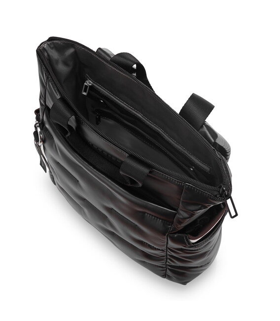 Місткий, дутий рюкзак-ідеальний супутник на кожен день. Оснащений великим основним відділенням з внутрішніми кишенями і знімною косметичкою. Із зовнішнього боку розташована кишеня на блискавці, також є бічні кишені для парасольки або пляшки з карабіном для ключів. Виконаний з щільного 100% polyester.