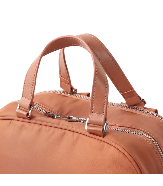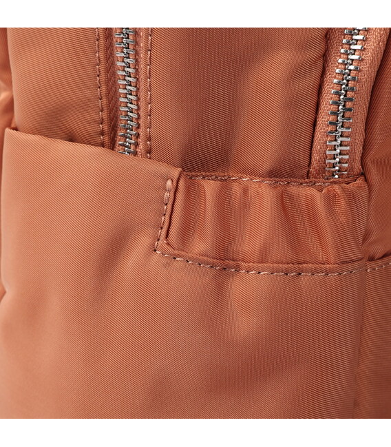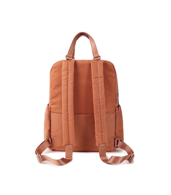 Жіночий рюкзак, середнього розміру. Оснащений зовнішньою кишенею на клапані з карабіном для ключів, містким основним відділенням де розміщений відділ для телефону та додаткова кишеня на блискавці з RFID-захистом. Друге відділення призначене для ноутбука 14" і документів формату А4. Також містить бічні кишені для парасольки або пляшки. На задній стороні рюкзака розміщений розумний рукав для кріплення на телескопічну ручку валізи. Також містить бічні кишені для парасольки чи пляшки. Виконаний зі 100% переробленого поліестеру PET (поліефірна тканина з перероблених пластикових пляшок).