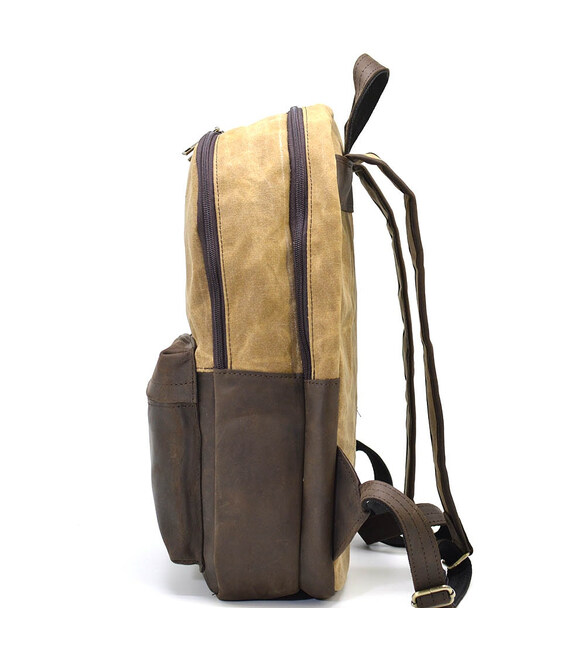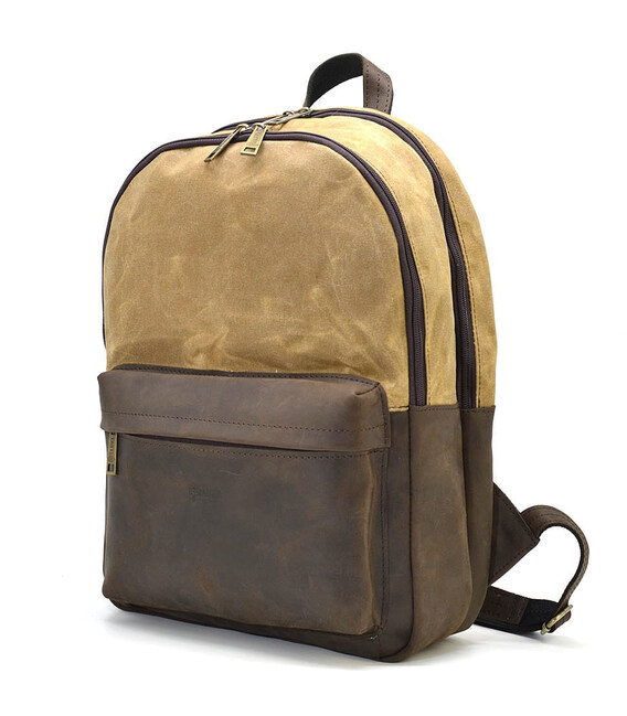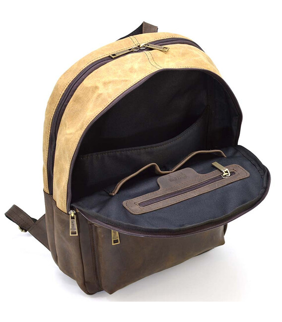 Рюкзак шкіра і воскований водостійкий коричневий канвас TARWA RCW-7273-3md на два відділення з вінтажної шкіри крейзі хорс. Два ізольованих відділення на блискавці. Комфортні кобіновані шлейки, передня кишеня, боковини та дно зі шкіри. Розміри: 40×31×13см Водостійкий просочений канвас з пулап ефектом