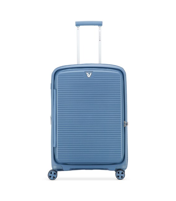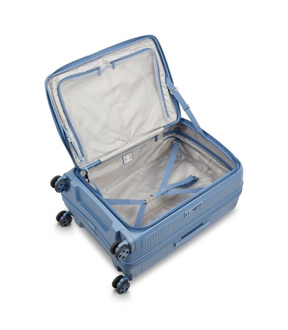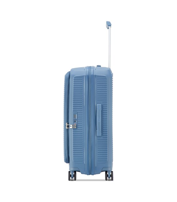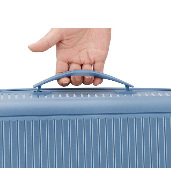 Валіза виготовлена з поліпропілену на 100% переробленого матеріалу, який пропонує: максимальну ударостійкість, надзвичайну міцність, оптимальну легкість, термостійкість. Оснащена 4 спареними і маневреними колесами. Для зручності переміщення передбачена еластична, підйомна пластикова ручка на верхній та бічній панелях, а також телескопічна ручка. Безпека і збереження багажу забезпечує вбудований кодовий замок з системою TSA. Серед найцінніших особливостей – інноваційна система FLAT TOP: кришка, що відкривається на 90° замість центрального отвору. Дизайн розроблений для зменшення об'єму та полегшення доступу до вмісту.