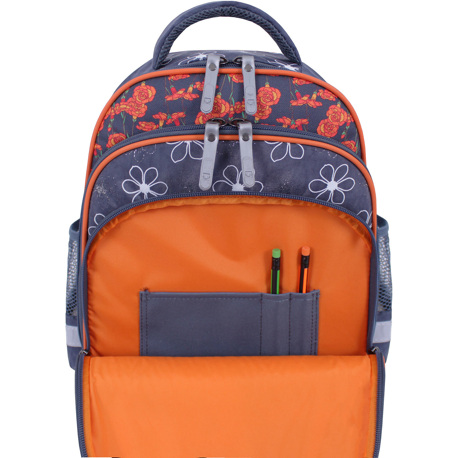 Основне й найбільше відділення підійде для підручників і спортивної форми. Друга кишеня призначена для зошитів, блокнотів чи альбому для малювання, а відсік-органайзер спереду — для дрібних канцтоварів і пеналу. Бічні сітчасті кишені вмістять пляшку з водою та парасольку.