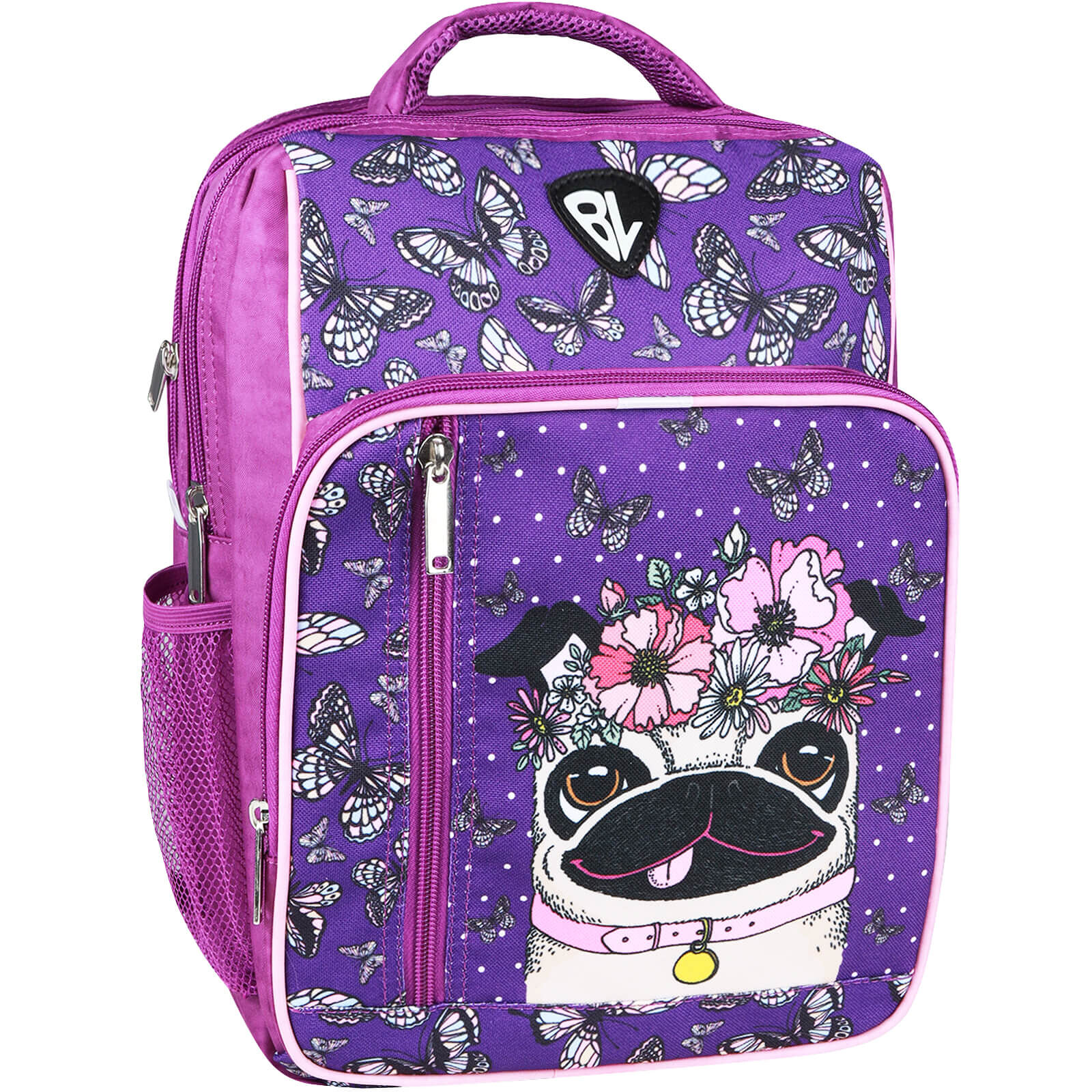 У рюкзаку — два просторі відділення на блискавці, де легко помістяться підручники, зошити або улюблені іграшки. Є також менше за розміром відділення з органайзером для канцтоварів — з ним можна обійтися без пенала. Спереду розташована зручна кишеня на блискавці для дрібниць — наприклад, телефону чи ключів. По боках — сітчасті кишені для пляшки з водою або термоса.