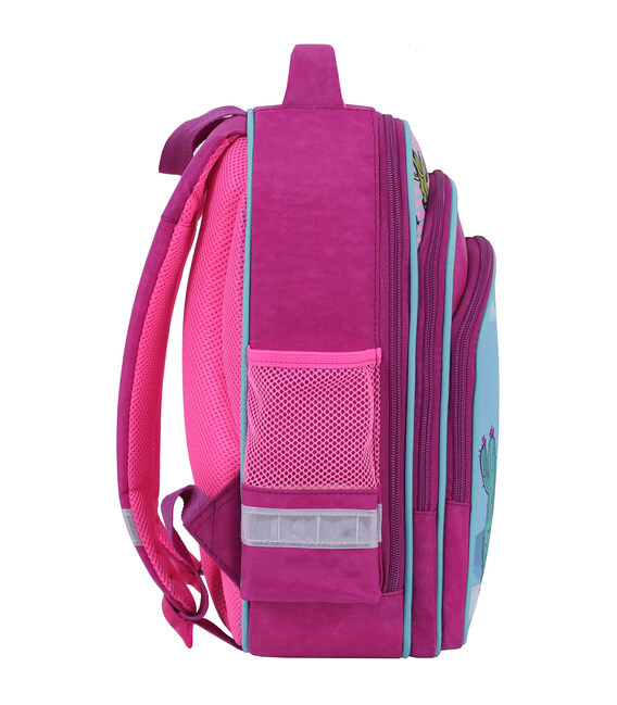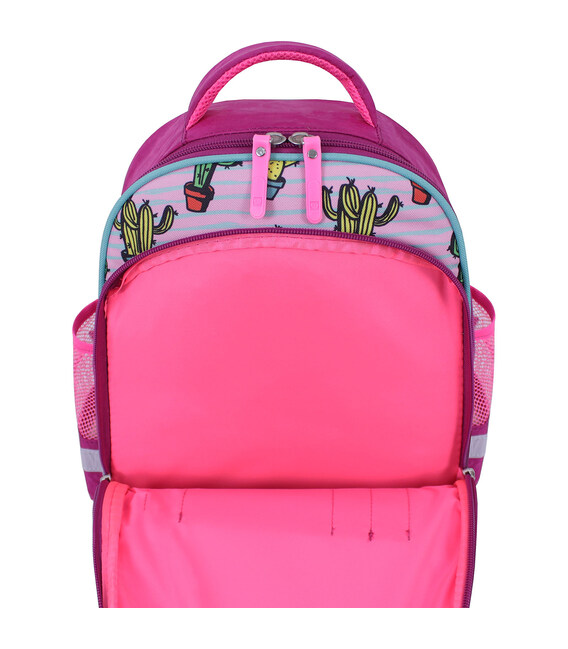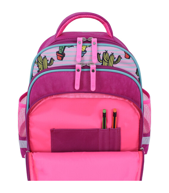 Основне й найбільше відділення підійде для підручників і спортивної форми. Друга кишеня призначена для зошитів, блокнотів чи альбому для малювання, а відсік-органайзер спереду — для дрібних канцтоварів і пеналу. Бічні сітчасті кишені вмістять пляшку з водою та парасольку.