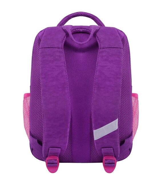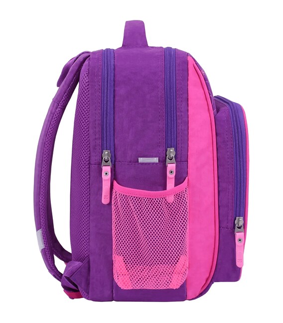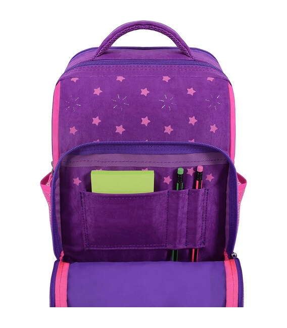 У рюкзаку — два просторі відділення на блискавці, де легко помістяться підручники, зошити або улюблені іграшки. Є також менше за розміром відділення з органайзером для канцтоварів — з ним можна обійтися без пенала. Спереду розташована зручна кишеня на блискавці для дрібниць — наприклад, телефону чи ключів. По боках — сітчасті кишені для пляшки з водою або термоса.
