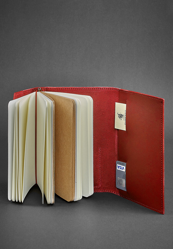 Червоний софт-бук створений для тих, хто цінує якісні матеріали та яскравий характер речей. Обкладинка виготовлена з натуральної шкіри насиченого червоного кольору, а всередині розміщено три знімні зошити. Вони тримаються на еластичній резинці та легко замінюються при потребі.