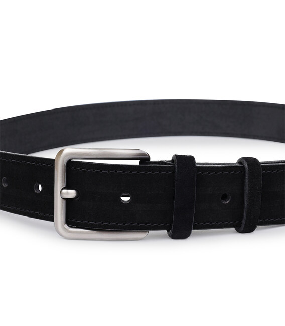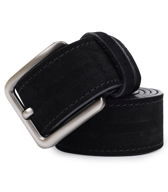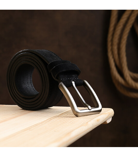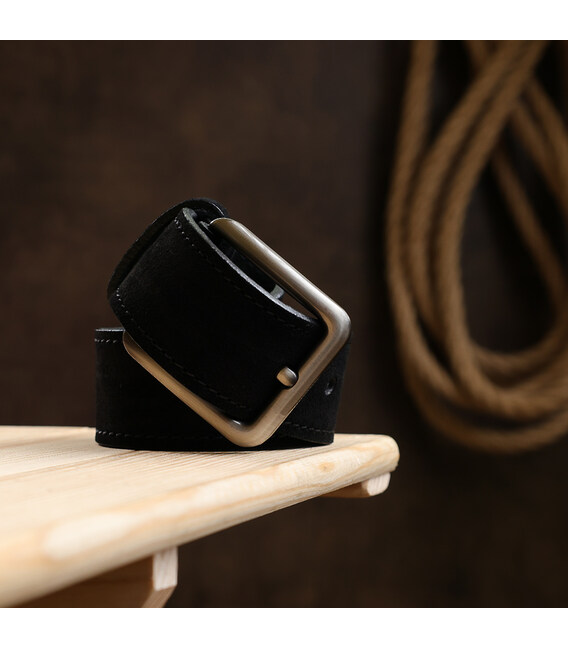 Гарний замшевий ремінь в універсальному чорному кольорі для чоловіків. Відмінно підійде під будь-який стиль одягу і взуття. Виконаний з натуральної високоякісної шкіри з прекрасними експлуатаційними показниками. Фактура виробу - м'яка і приємна на дотик, пряжка - класична.