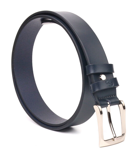 Стильний ремінь з натуральної італійської шкіри, в синьому кольорі від українського виробника. Аксесуар має гладку фактуру, довжина регулюється у менший бік. Пряжка класична в мінімалістичному дизайні, виробник використовує виключно італійську фурнітуру, яка не темніє, не дряпається та не викликає алергії. Якщо Ви хочете зробити подарунок чоловікові, за який не буде соромно, такий ремінь стане відмінним вибором, оскільки він не тільки красивий, але і якісний.