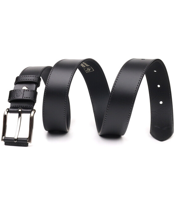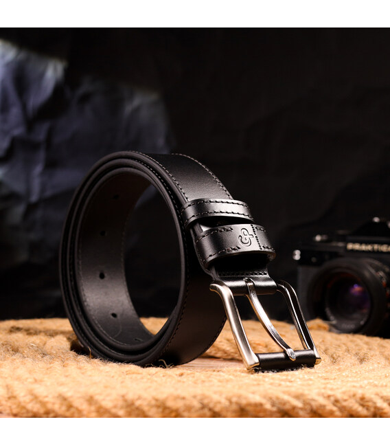 Практичний шкіряний ремінь чорного кольору з натуральної шкіри від українського виробника. Хороший ремінь здатний ідеально завершити образ та підкреслити ваш статус. Ремінь виготовлений із цілісного полотна шкіри. Аксесуар має гладку фактуру, акуратно пошитий, довжина регулюється у менший бік. Доповнено ремінець сріблястою пряжкою з гострими кутами. Шкіряний ремінь один із найвдаліших та потрібних подарунків для будь-якого чоловіка.
