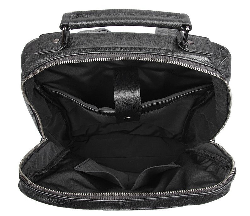 Виріб виконаний з натуральної високоякісної шкіри у чорному кольорі. Матеріал приємний на дотик, відрізняється зносостійкістю і добре підходить для активного щоденного використання. Усередині передбачена щільна текстильна підкладка чорного кольору, а якісна фурнітура гармонійно доповнює загальний дизайн моделі. Рюкзак зручно носити як на плечах, так і в руці завдяки короткій шкіряній ручці.