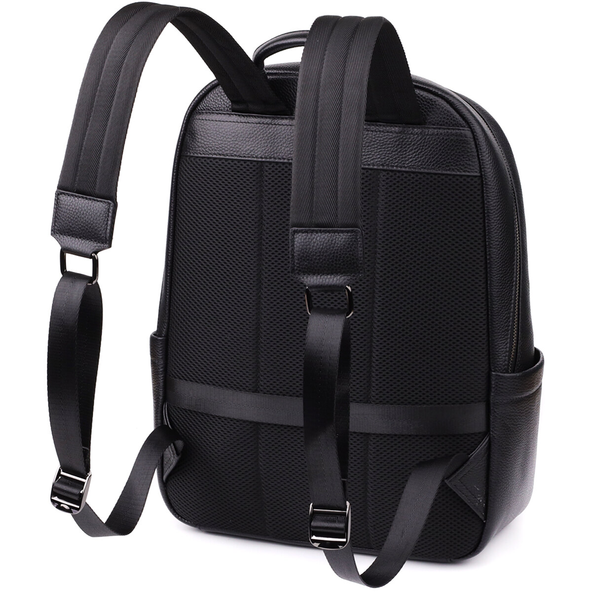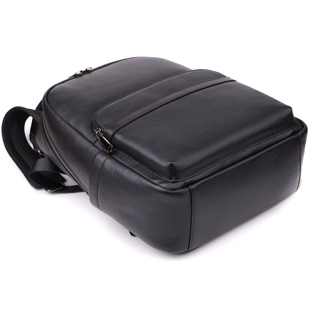 Чоловічий шкіряний рюкзак виконаний з натуральної шкіри з виразною текстурою та оснащений одним основним відділенням на блискавці з двома бігунками, що забезпечує зручний доступ та місткість. Усередині знаходяться дві відкриті кишені для зручної організації дрібних речей. На лицьовій стороні розташована накладна кишеня на блискавці, яка підходить для швидкого доступу до необхідних предметів. Для комфортного перенесення передбачена шкіряна ручка, м'які лямки, що регулюються, і ортопедична спинка, яка знижує навантаження на хребет при тривалому носінні. Фурнітура виконана в кольорі темного срібла, підкреслюючи стиль та елегантність моделі. Цей рюкзак стане надійним та зручним супутником у повсякденному житті.