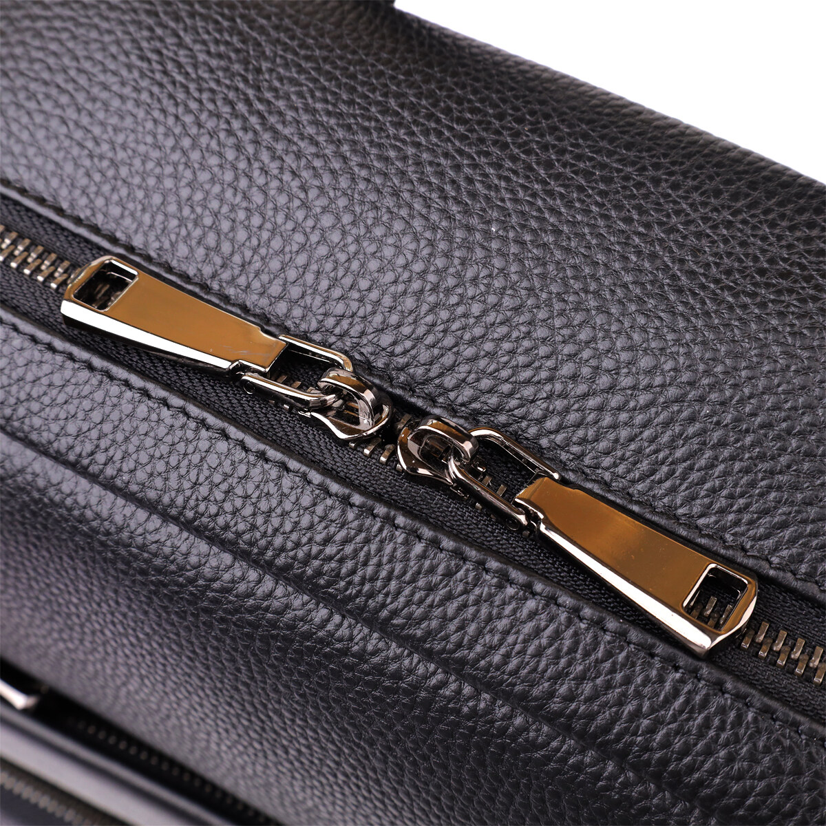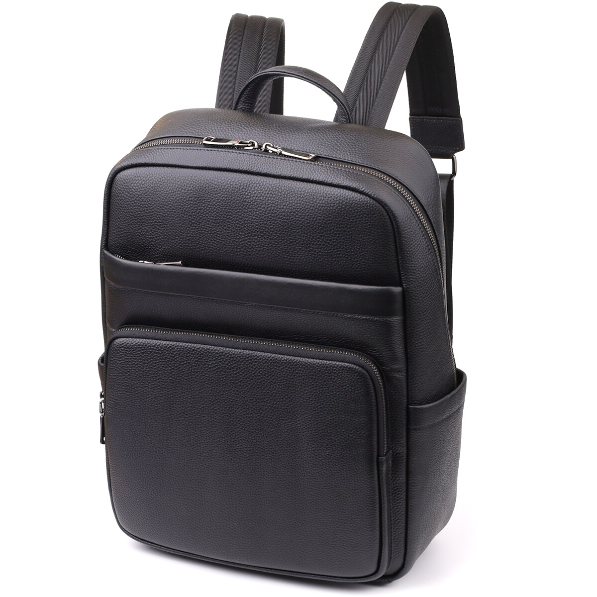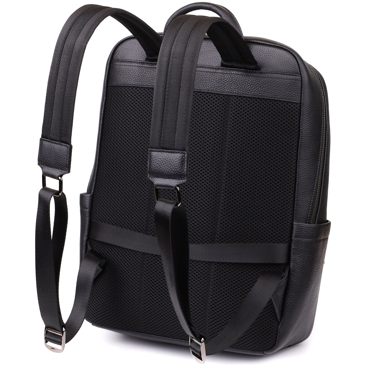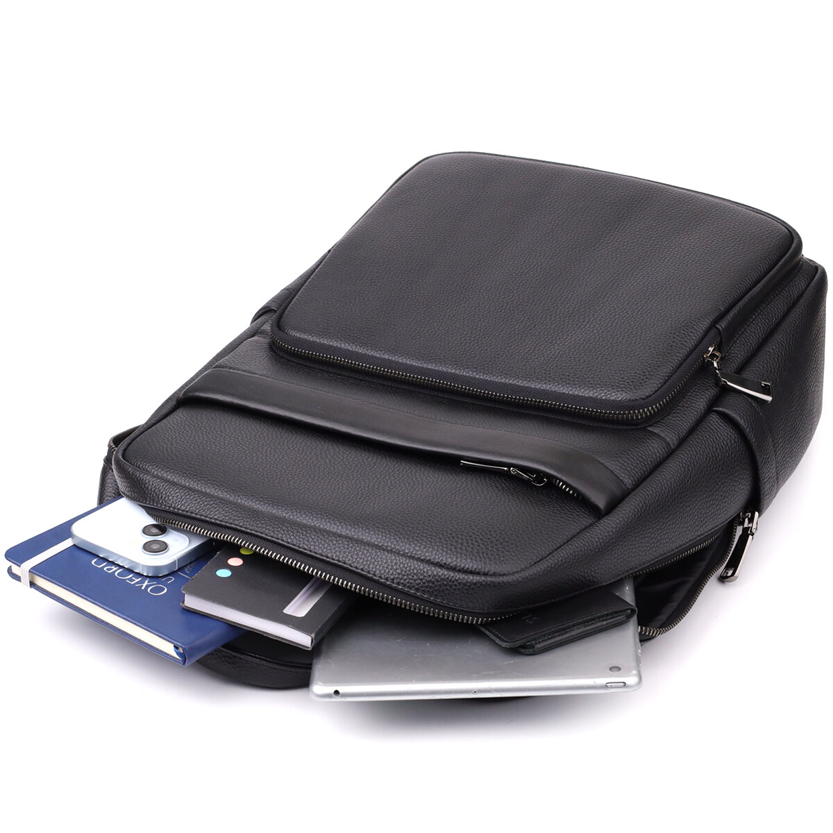 Великий шкіряний рюкзак створений для тих, хто цінує комфорт та функціональність. Він оснащений одним просторим основним відділенням на блискавці з двома бігунками, всередині якого знаходяться дві кишені відкритого типу і одна кишеня на блискавці для зручної організації дрібних речей. На лицьовій стороні розташовані накладна і вбудована кишені, що закриваються на блискавку, а з боків — дві додаткові кишені для аксесуарів та пляшки води.