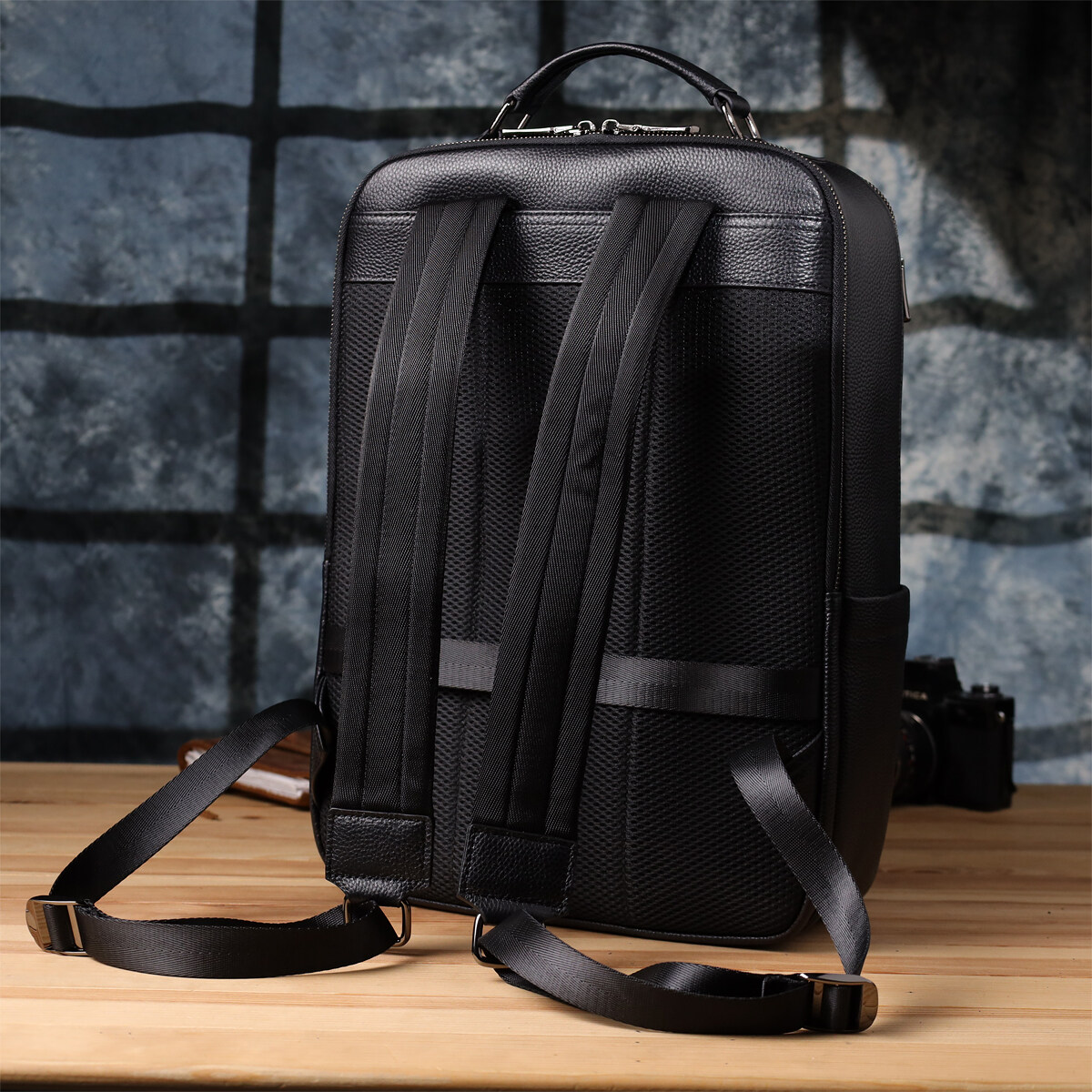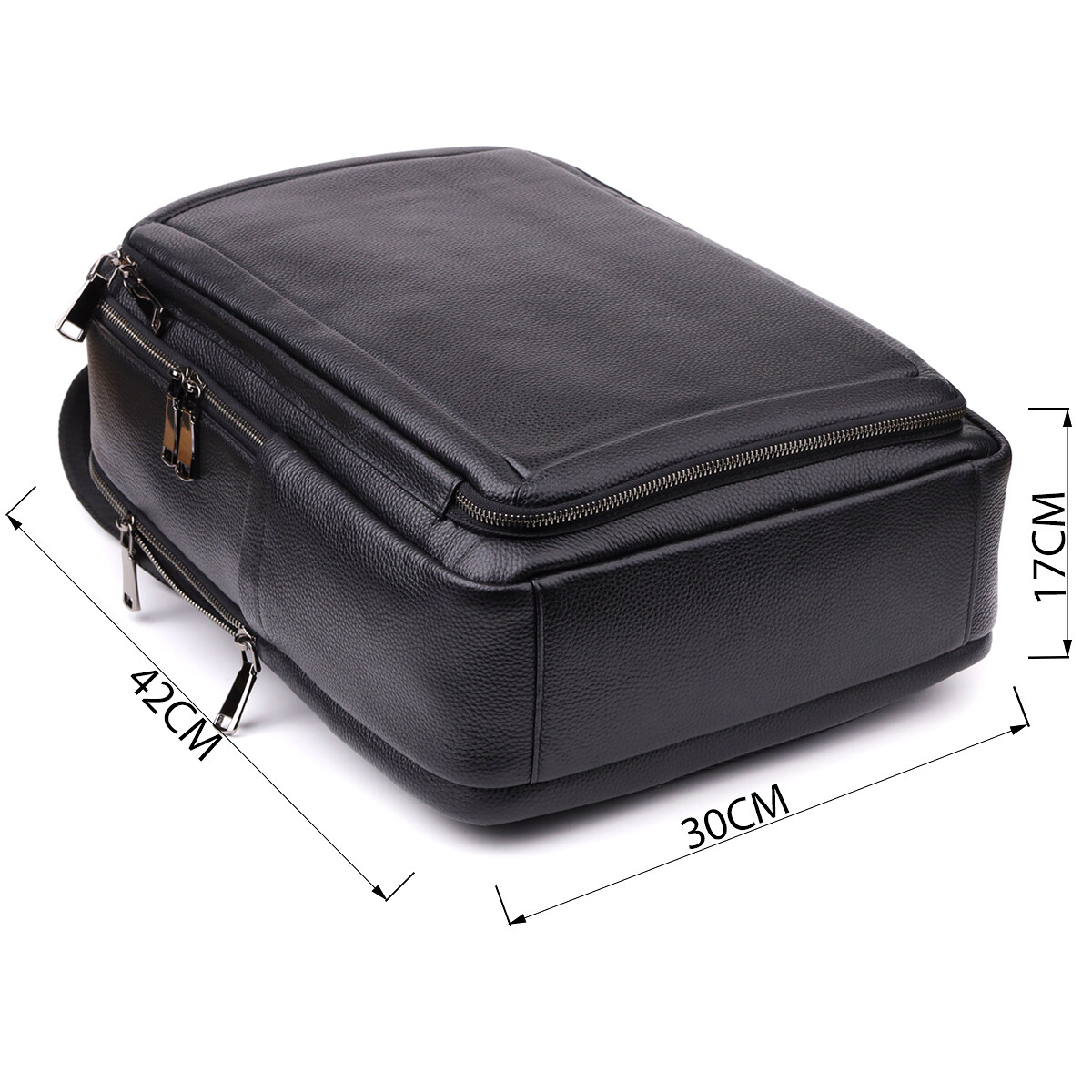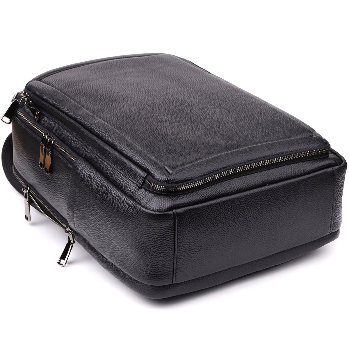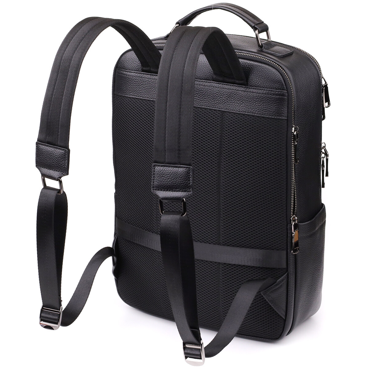 Для комфортного перенесення передбачені дві шкіряні ручки - зверху та збоку, а м'які регульовані лямки та ортопедична спинка гарантують зручність навіть при тривалому використанні. Фурнітура темного срібла підкреслює стриманий та елегантний образ рюкзака, роблячи його універсальним аксесуаром для міста, роботи та подорожей.