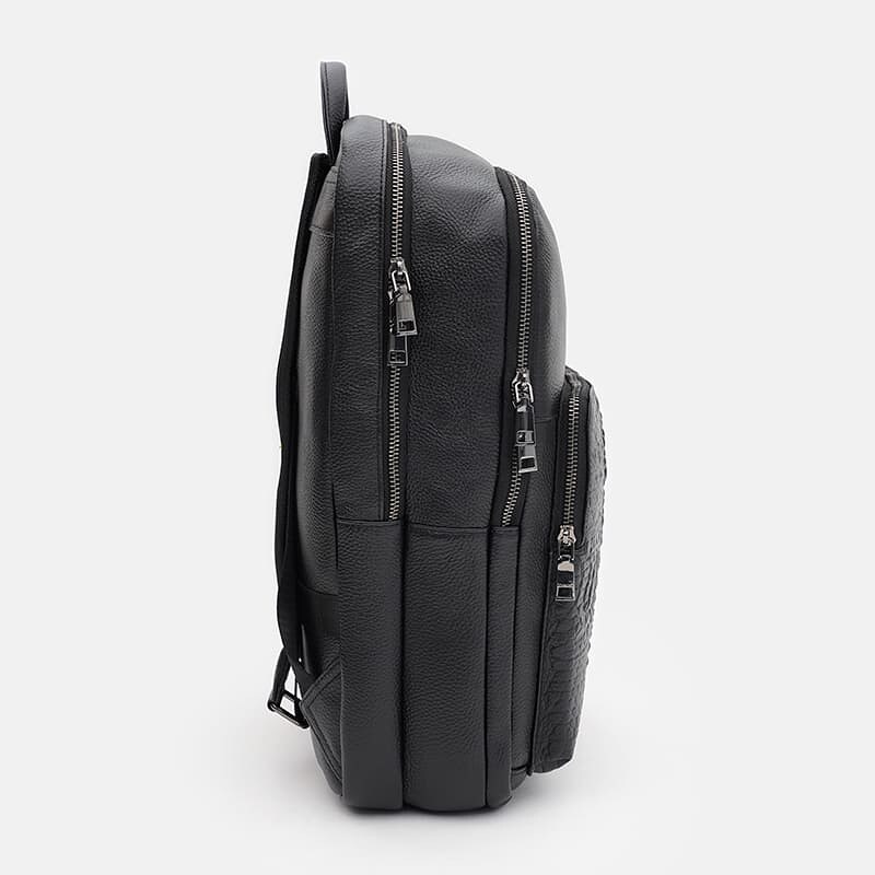 Чоловічий шкіряний рюкзак-практичний аксесуар для міста та подорожей. Закривається на блискавку. Має 2 основні відділення. Всередині є відділ під ноутбук або планшет, також є одна кишеня на блискавці. З лицьового боку-1 містка кишеня на блискавці. На задній стороні рюкзака є кріплення для валізи. Текстиль підкладка. Є незнімна ручка зі шкіри, плечові ремені (ущільнений текстиль) регулюються по довжині.
