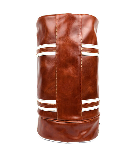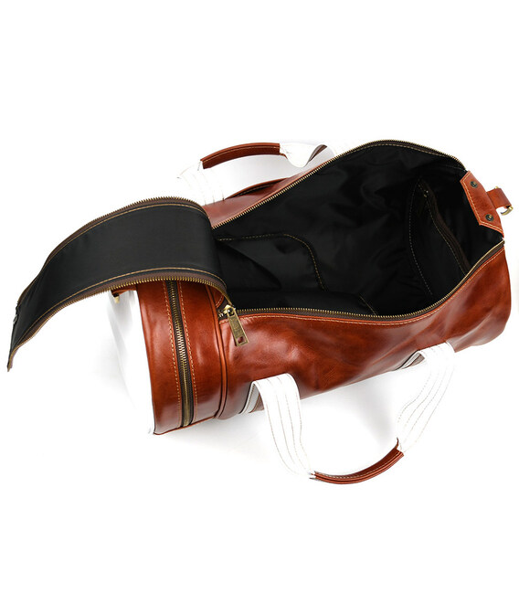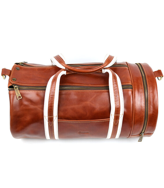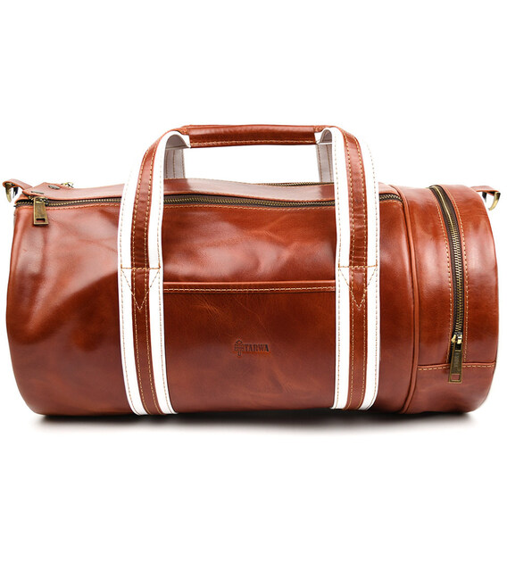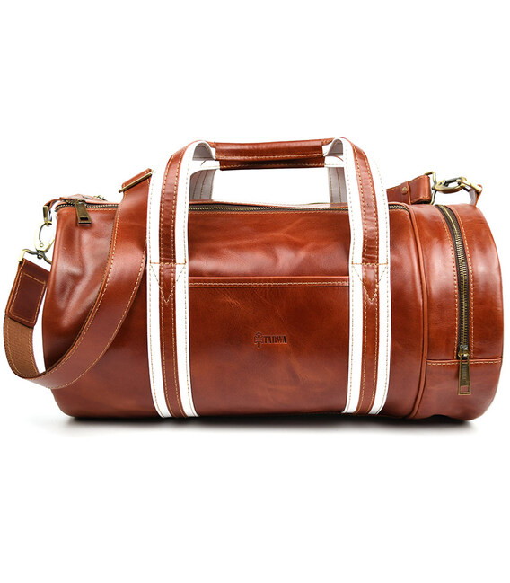 Спортивна шкіряна сумка люкс класу TARWA GBal-5565-4lx коньячна. Спортивна шкіряна сумка люкс сегмента TARWA GSR-5565-4lx в комбінації білої шкіри і шкіри алькор в коньячному кольорі Стильна сумка для спотзалу, лазні, сауни, яка вдало впишеться в інтер'єр вашого спорткара або позашляховика.
