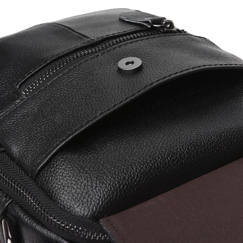 Шкіряна чоловіча сумка має два незалежних відсіки і кілька додаткових відділень, кожне з яких оснащено блискавкою. Накладка з магнітною застібкою додатково захищає від проникнення, а місткі кишені з лицьової і тильної сторін закриваються на змійку. Підкладка текстиль. Фурнітура- металева. Текстильний ремінь регулюється по довжині.