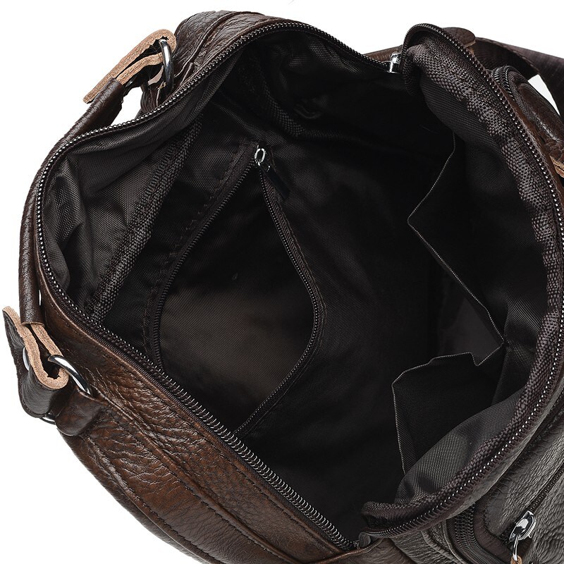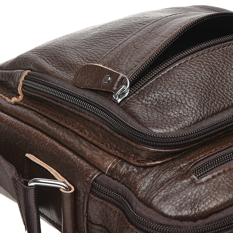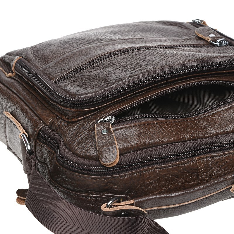 Стильний практичний месенджер на плече з натуральної шкіри. Сумка - містка і має багато кишень. Одне основне відділення на блискавці, всередині 2 кишені для дрібниць і 1 кишеня на блискавці. З лицьового боку-1 велика накладна кишеня і 2 кишені на блискавці. З тильного боку-1 кишеня на блискавці. Підкладка текстиль. Фурнітура- металева. Плечовий ремінь регулюється по довжині.