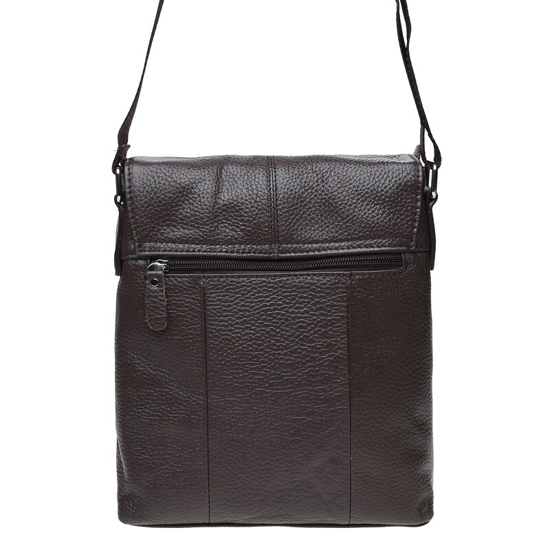 Стильний месенджер коричневого кольору відмінно доповнить гардероб практичних чоловіків. Закривається на клапан з кнопками. Має 1 відділення з 3 кишенями всередині. З лицьового боку-2 кишені. З тильного боку -1 кишеня на блискавці. Подкладкка- текстиль. Колір фурнітури срібло. Незнімний ремінь регулюється по довжині.
