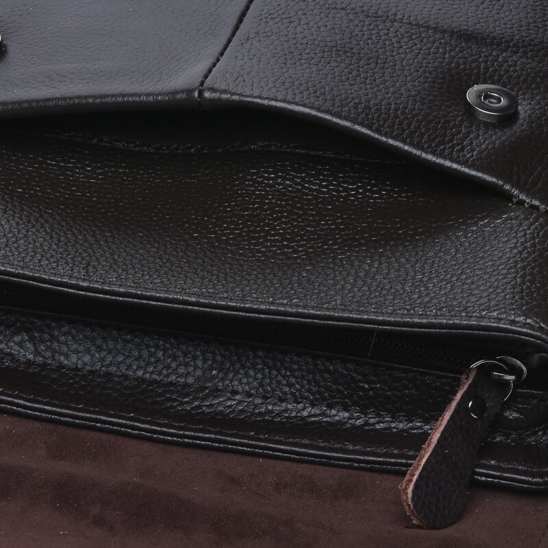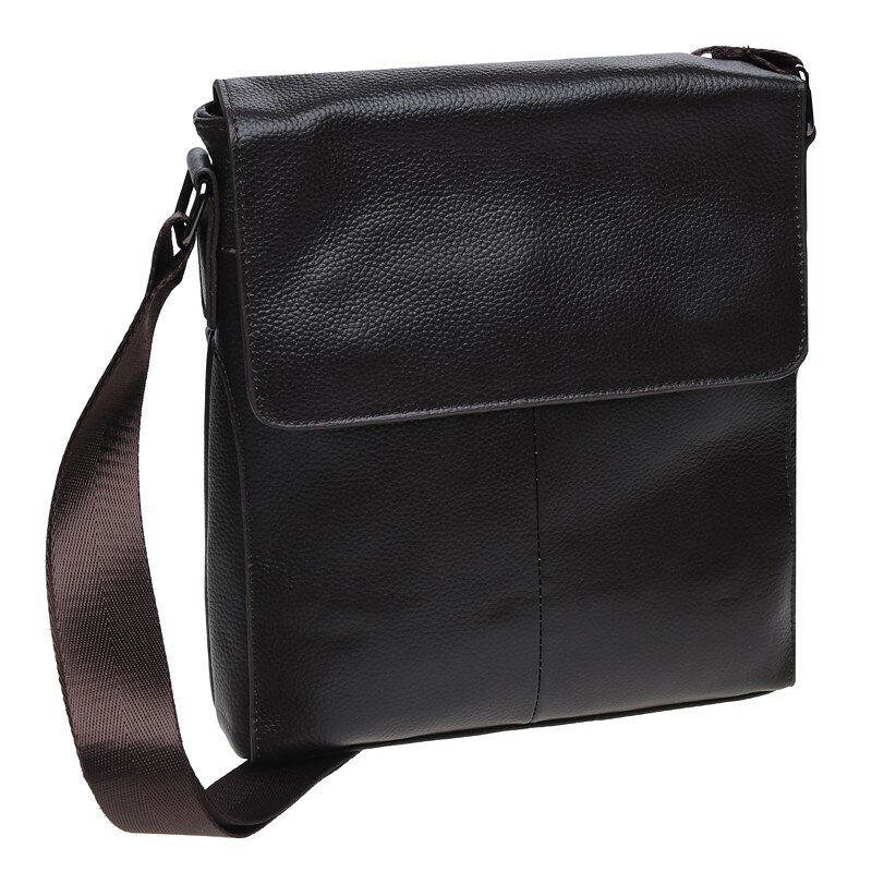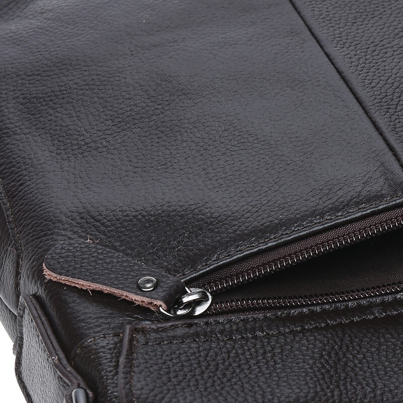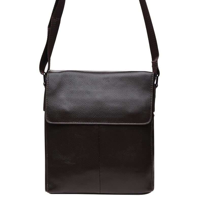 Класичний варіант чоловічої шкіряної сумки на плече. Мессенджер більше середнього розміру, місткий і практичний. Закривається на клапан, має 1 основне відділення. Всередині 1 кишеня на блискавці і 2 кишені для дрібниць. З лицьового боку-1 накладна кишеня. З тильного боку-1 кишеня на блискавці. Подкладкка- текстиль. Колір фурнітури срібло. Незнімний ремінь регулюється по довжині.