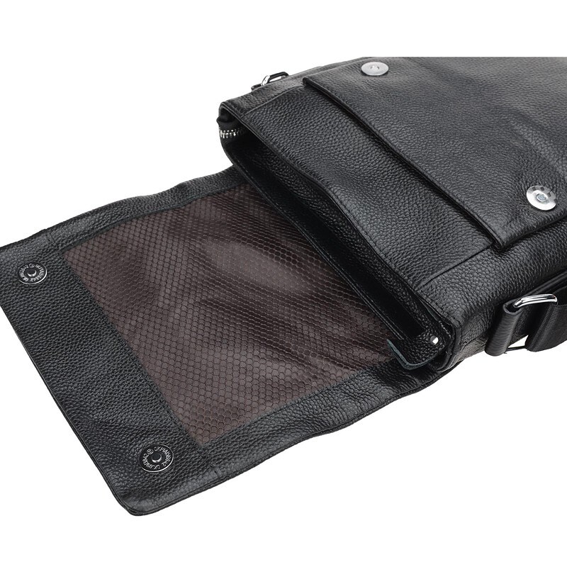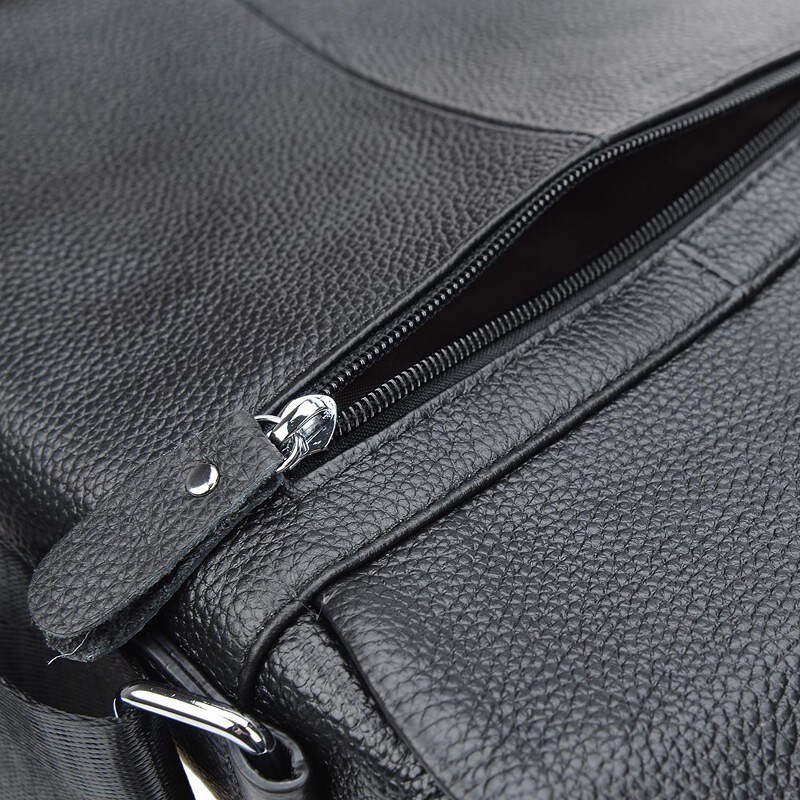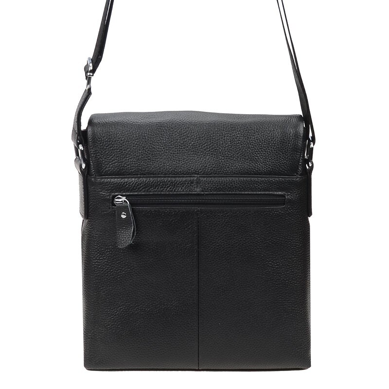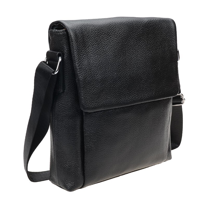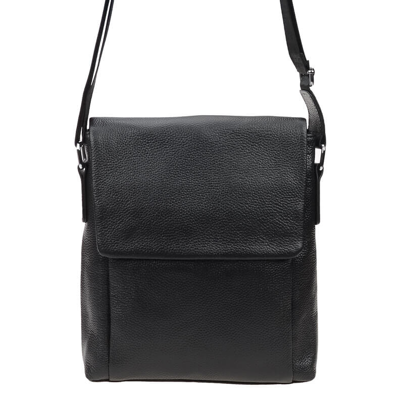 Стильна шкіряна сумка через плече-важливий аксесуар для чоловіка на кожен день. Закривається на клапан, всередині одне відділення на блискавці і 3 кишені для дрібниць. Зовні 1 кишеня на блискавці і 1 накладна кишеня з лицьового боку сумки. Підкладка текстиль. Колір фурнітури срібло. Має текстильний регульований ремінь.