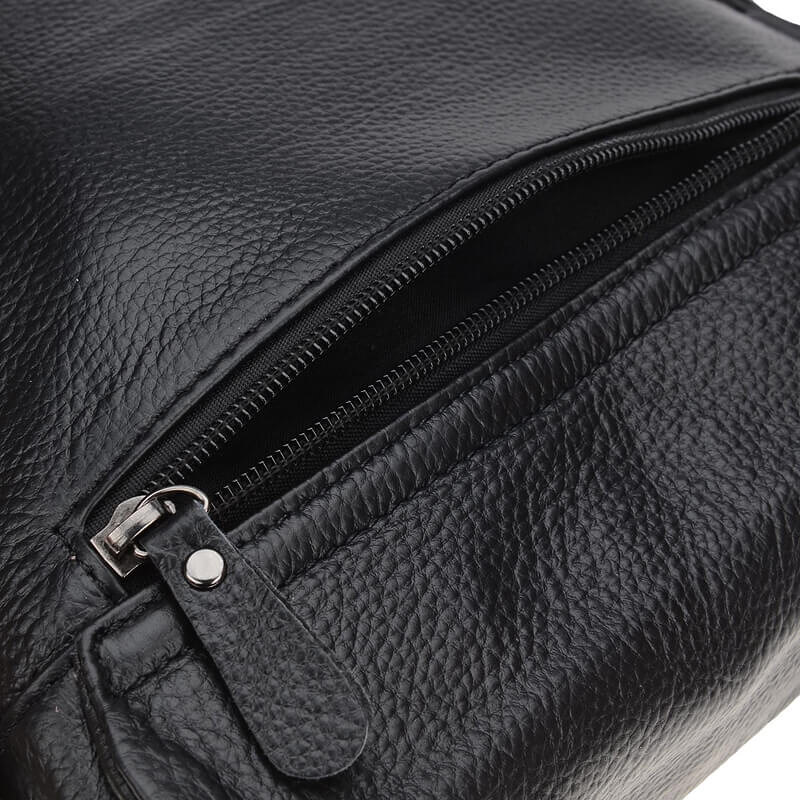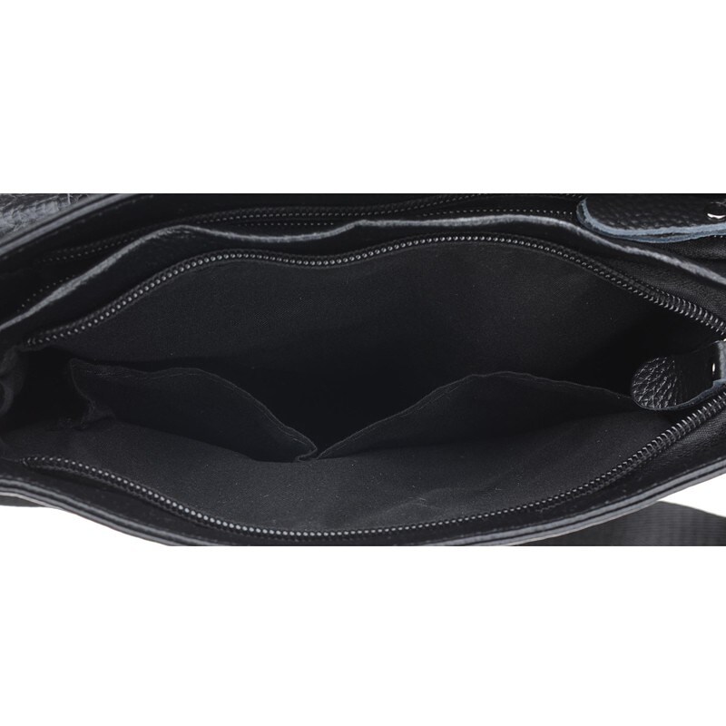 Чоловіча шкіряна сумка через плече або месенджер є дуже потрібним і практичним аксесуаром для сучасного чоловіка. Ця сумка стильно виглядає, якісно зроблена і гармонійно виглядає з будь-яким одягом, а завдяки своїй квадратній формі - зручна в носінні. Сумка закривається на перекидний клапан, всередині 2 відділення, які закриваються блискавкою. Всередині відділів 3 кишені для дрібниць. Зовні сумки ще 1 глибоку кишеню на блискавки. Підкладка - текстиль. Колір фурнітури - срібло. Має текстильний регульований ремінь.