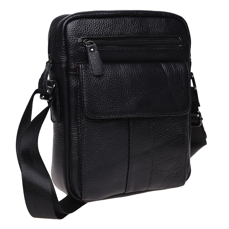 Чоловіча шкіряна сумка виконана з натуральної шкіри. Має 1 основне відділення на блискавці. Всередині 3 кишені. Зовні 1 накладна кишеня на кнопках і 2 кишені на блискавці. Підкладка: текстиль. Колір фурнітури срібло. Має незнімний плечовий ремінь.
