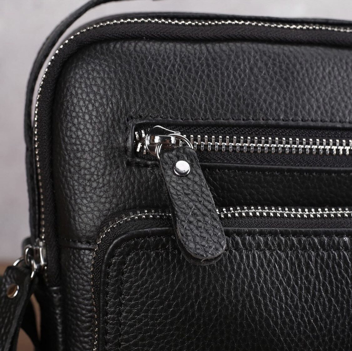 Шкіряний чоловічий месенджер виконаний з м'якої натуральної шкіри. Аристократичний чорний колір підкреслює статусність власника. Лаконічний дизайн дозволяє використовувати аксесуар із повсякденним або діловим одягом. У сумці є зручна коротка ручка та текстильний незнімний плечовий ремінь, що регулюється по довжині. На сумку встановлено надійну металеву фурнітуру. Зовні з лицьового боку розміщено дві кишені для зберігання особистих речей, до яких необхідний швидкий доступ. А в головному відділенні можна розмістити такі предмети, як планшет, термочашку, блокнот або книгу.