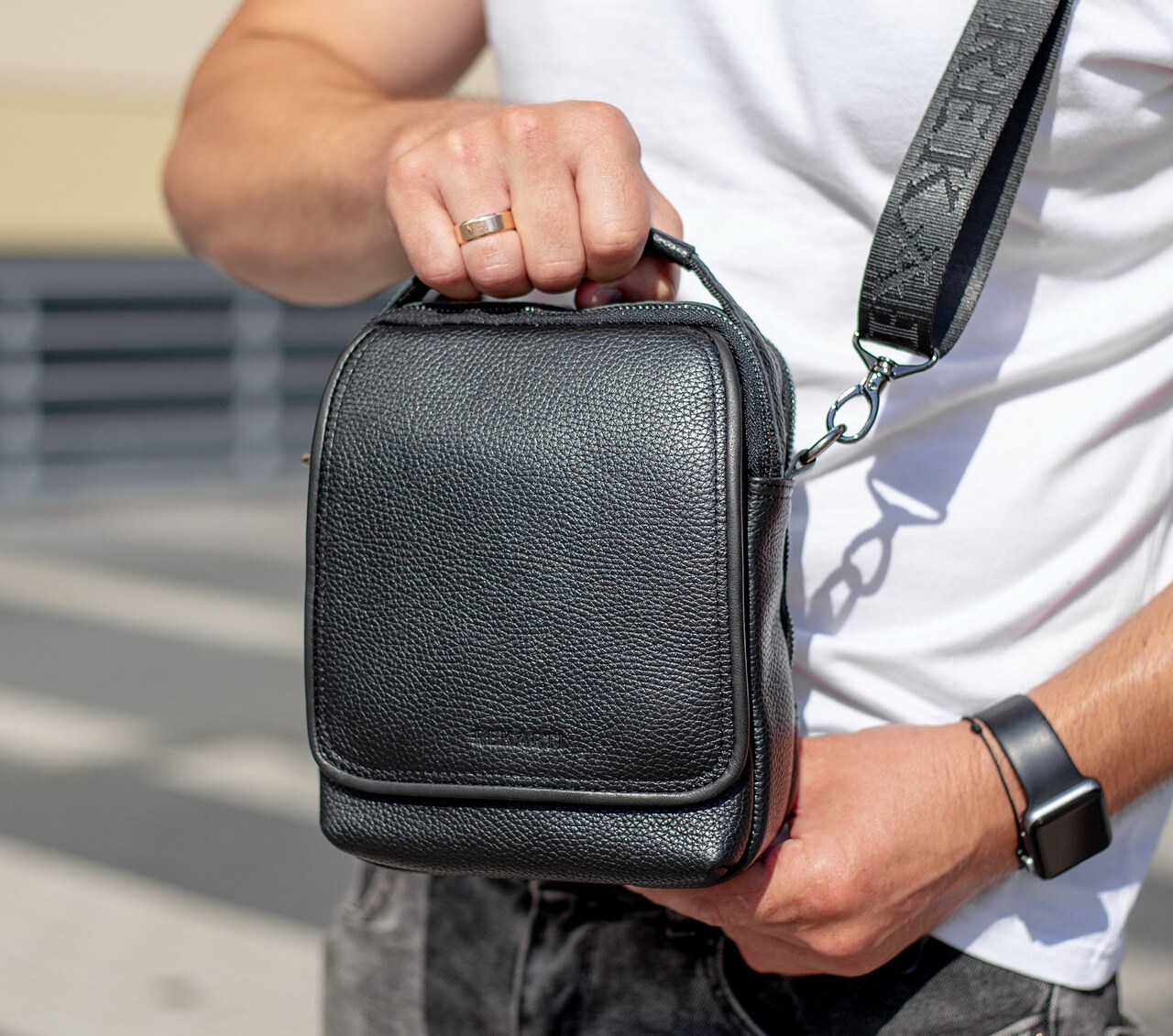 Доволі вмістовна чоловіча сумка через плече, виготовлена з високоякісної натуральної шкіри. Сумка має два рівномірні основні відділення, в одному з котрих знаходиться бокова кишеня на блискавці, а також кишеня відкритого типу. Крім основних, сумка має також два додаткові відділення-кишені: з тильної частини (на блискавці) та з лицьової (без застібки під накидкою). Кожне відділення застібається за допомогою якісної фурнітури. Усередині сумка обшита щільною підкладкою. Ремінець сумки щільний, регульований, знімний, а коротка ручка зручна для експлуатації в одній руці.
