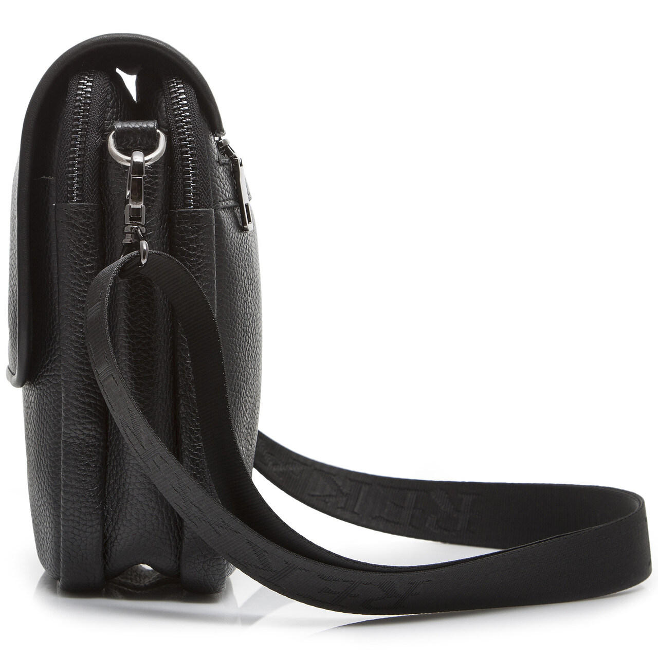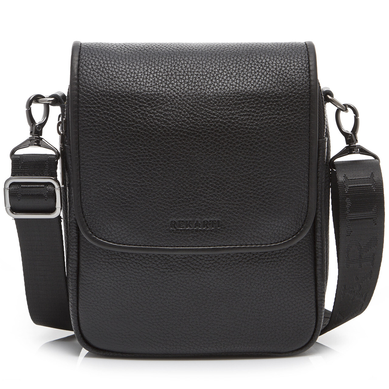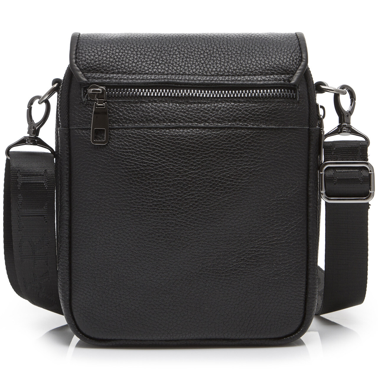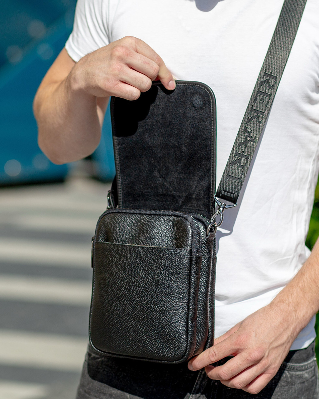 Доволі вмістовна чоловіча сумка через плече, виконана з м'якої високоякісної натуральної шкіри. Два основних відділення рівномірні, одне з них має бокову кишеню на блискавці, а також кишеню відкритого типу. Між основними відділеннями є додаткове відділення на магнітній кнопці. З тильної частини сумки знаходиться кишеня на блискавці, а з лицьової частини – глибоке відділення без застібки під накидкою. Відділення застібаються за допомогою якісної фурнітури. Внутрішнє оздоблення сумки - щільна підкладка. Ремінь сумки текстильний, знімний, надійно кріпиться за допомогою карабіна.