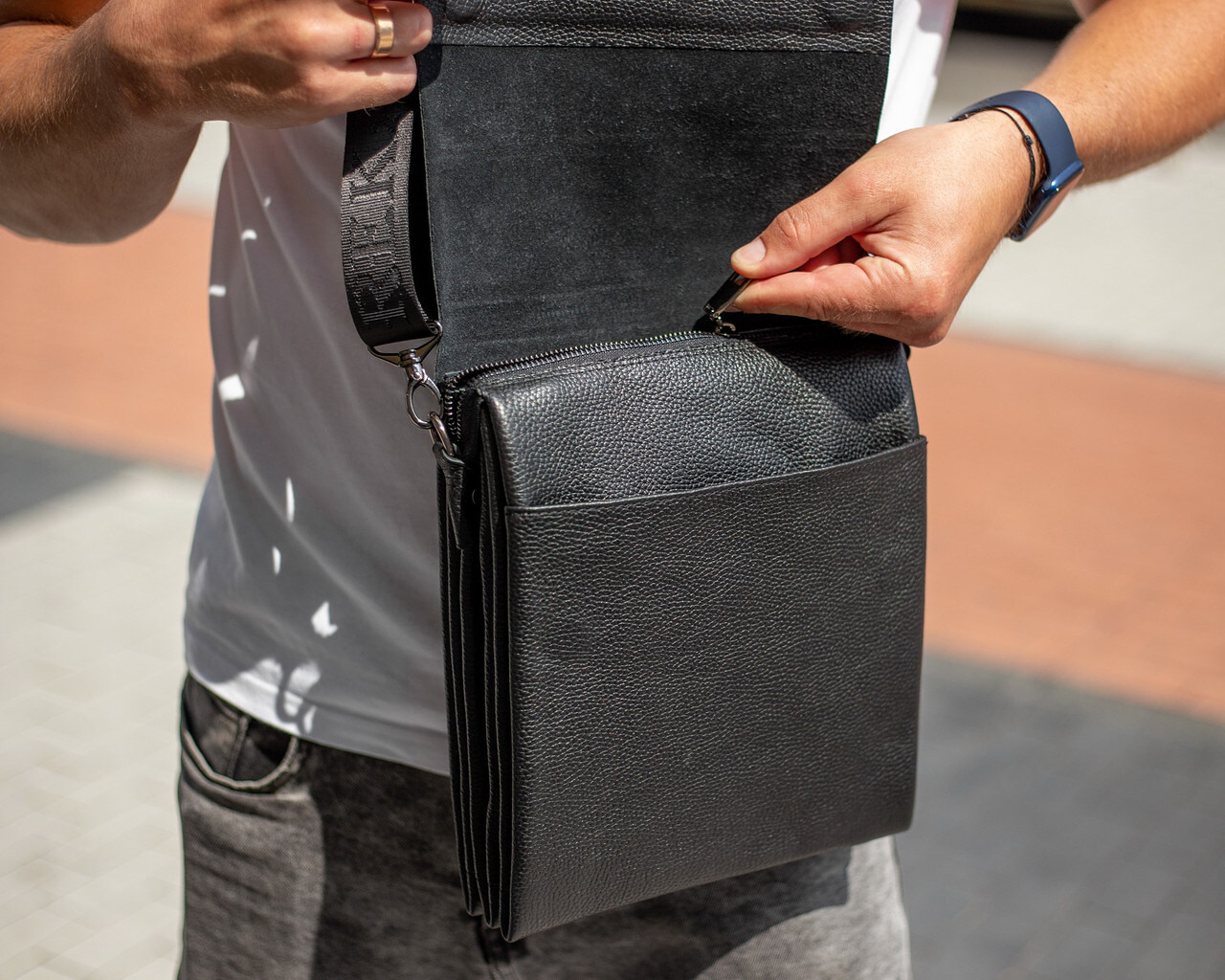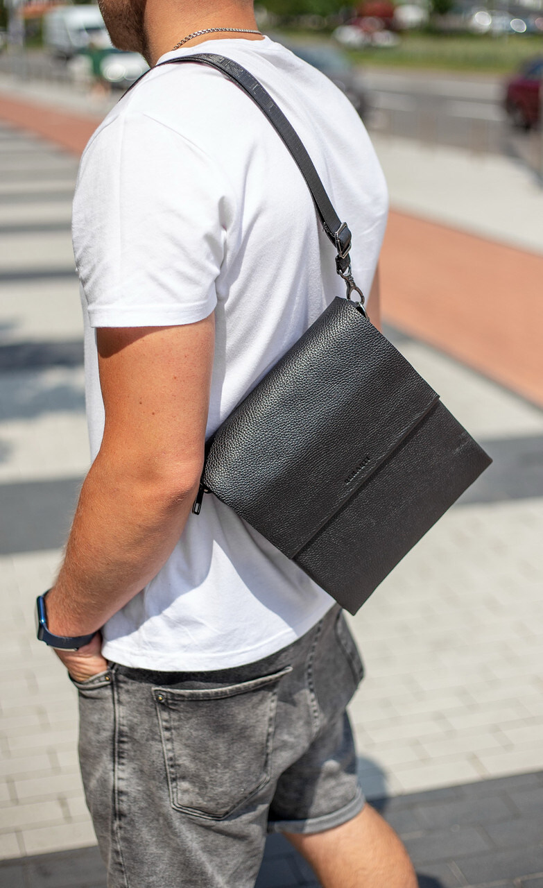 Стильна чоловіча сумка через плече, виготовлена з високоякісної натуральної шкіри. Під накидкою розміщене одне основне відділення, у якому розміщена потайна кишеня на блискавці, а також кишеня відкритого типу. Сумка має два додаткові відділення: одне з лицьової частини (під накидкою, без застібки) й одне з тильної частини (на блискавці). Відділення застібаються за допомогою якісної фурнітури. Ремінець сумки щільний, регульований, незнімний.