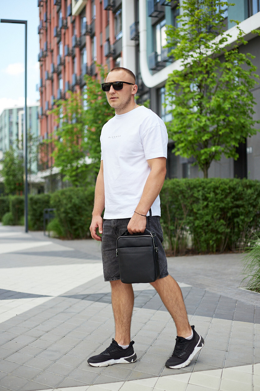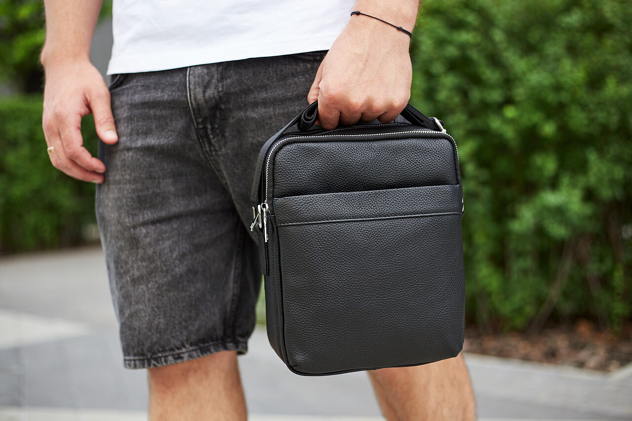 Чудова чоловіча сумка вертикального формату, виготовлена з натуральної шкіри чорного кольору. Вона відмінно доповнить як діловий, так і повсякденний стиль і стане Вашим улюбленим аксесуаром, завдяки своїй практичності. Чоловіча сумка через плече чорного кольору. У сумки є два основних відділення, всередині яких є маленька кишеня на замку і кишеня відкритого типу, а також з лицьової і тильної сторони є дві кишені на замку.