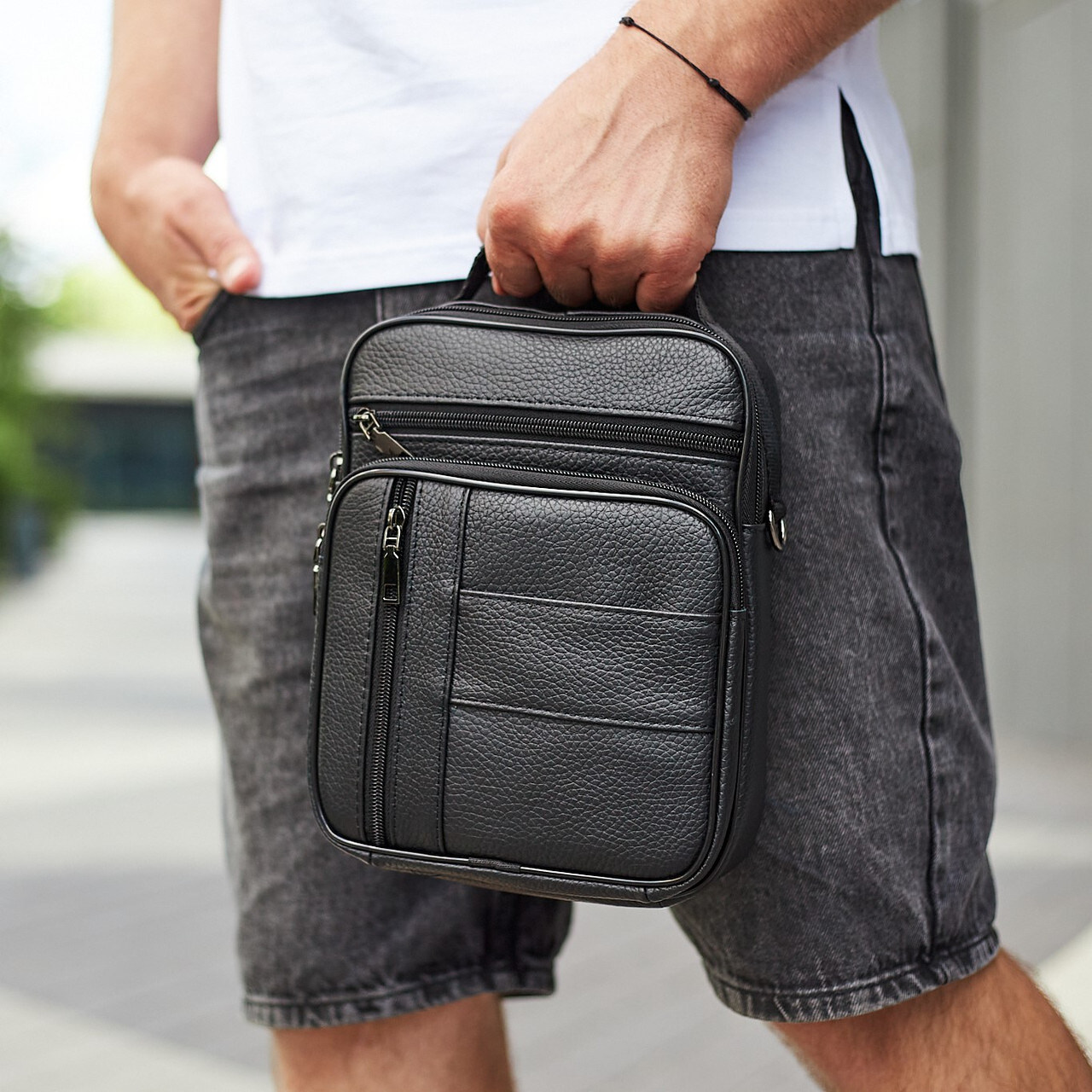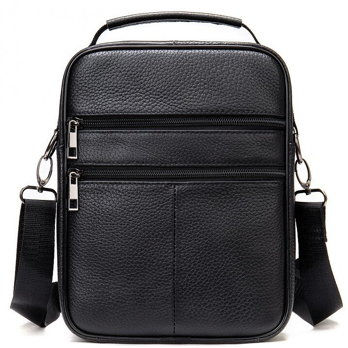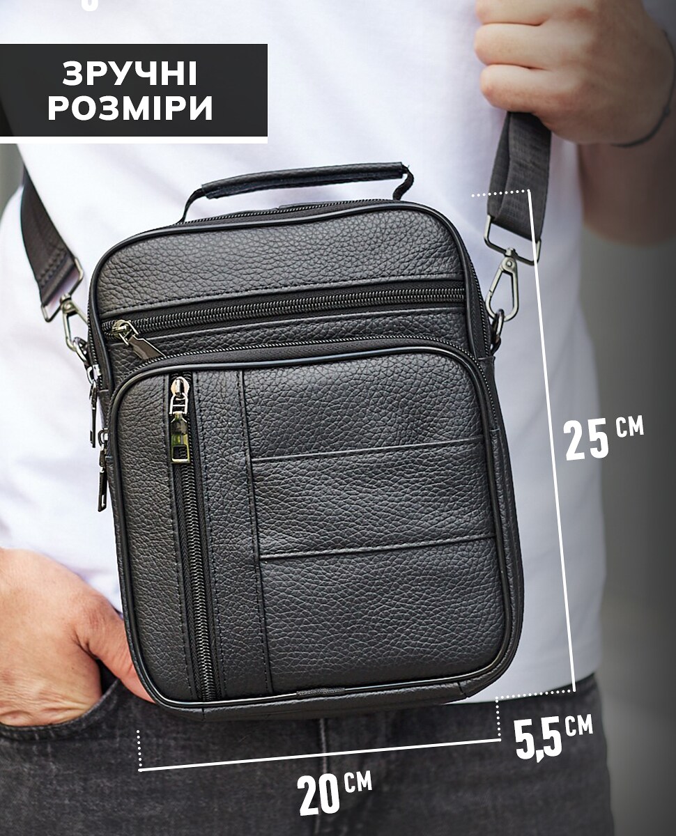 Лаконічна чоловіча сумка на плече виконана з високоякісної натуральної шкіри, м'якої на дотик. Виріб має два рівномірні основні відділення, всередині яких знаходяться бічна кишеня на блискавці, а також кишеня відкритого типу. Крім основних відділень, сумка має зовні також три додаткові відділення-кишені (з лицьової та тильної частини). Кожне відділення застібається за допомогою якісної фурнітури. Усередині сумка оброблена щільною підкладкою. Ремінець сумки щільний, регульований, знімний, а коротка зручна ручка в руці.