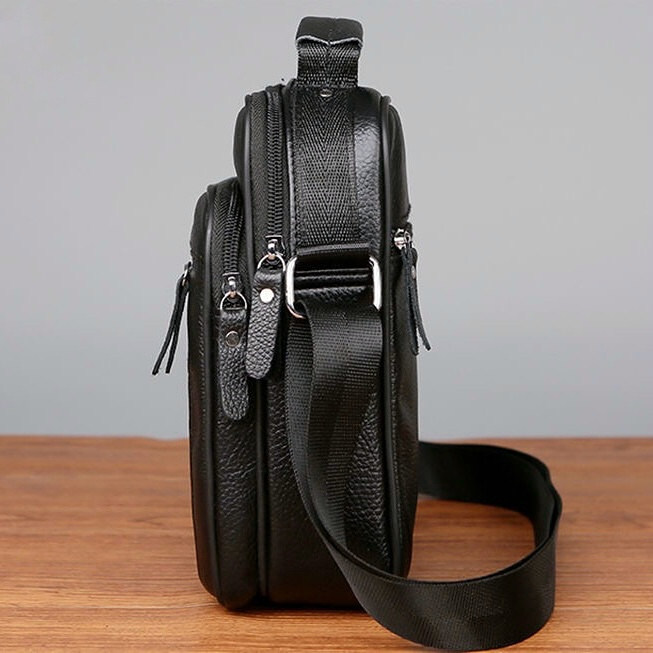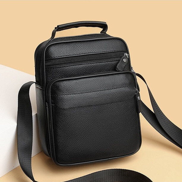 Чоловічий месенджер із натуральної шкіри, має насичений чорний колір і чудову металеву фурнітуру. Також модель обладнана довгим текстильним ременем, який регулюється за довжиною та м'якою шкіряною ручкою. Шкіряна чоловіча сумка з ручкою має два автономні відділення, які застібаються за допомогою блискавок. На тильній стороні сумки розташована одна кишеня на блискавці. На своїй лицьовій частині сумки розміщені: одна досить містка кишеня і дві додаткові допоміжні, які так само закриваються за допомогою блискавок.