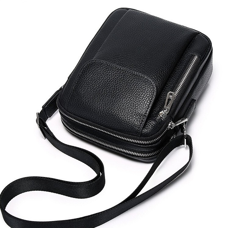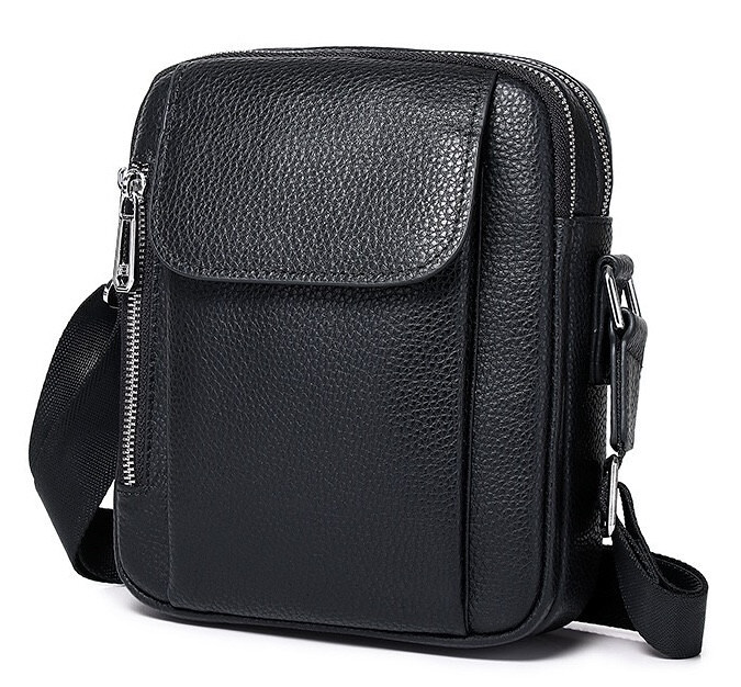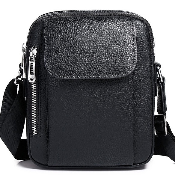 Лаконічна чоловіча сумка на плече виконана з високоякісної натуральної шкіри, м'якої на дотик. Виріб має два рівномірні основні відділення, всередині яких знаходяться бічна кишеня на блискавці, а також кишеня відкритого типу. Крім основних відділень, сумка має зовні також три додаткові відділення-кишені (з лицьової та тильної частини). Кожне відділення застібається за допомогою якісної фурнітури. Усередині сумка оброблена щільною підкладкою. Ремінець сумки щільний, регульований, знімний, а коротка зручна ручка в руці.