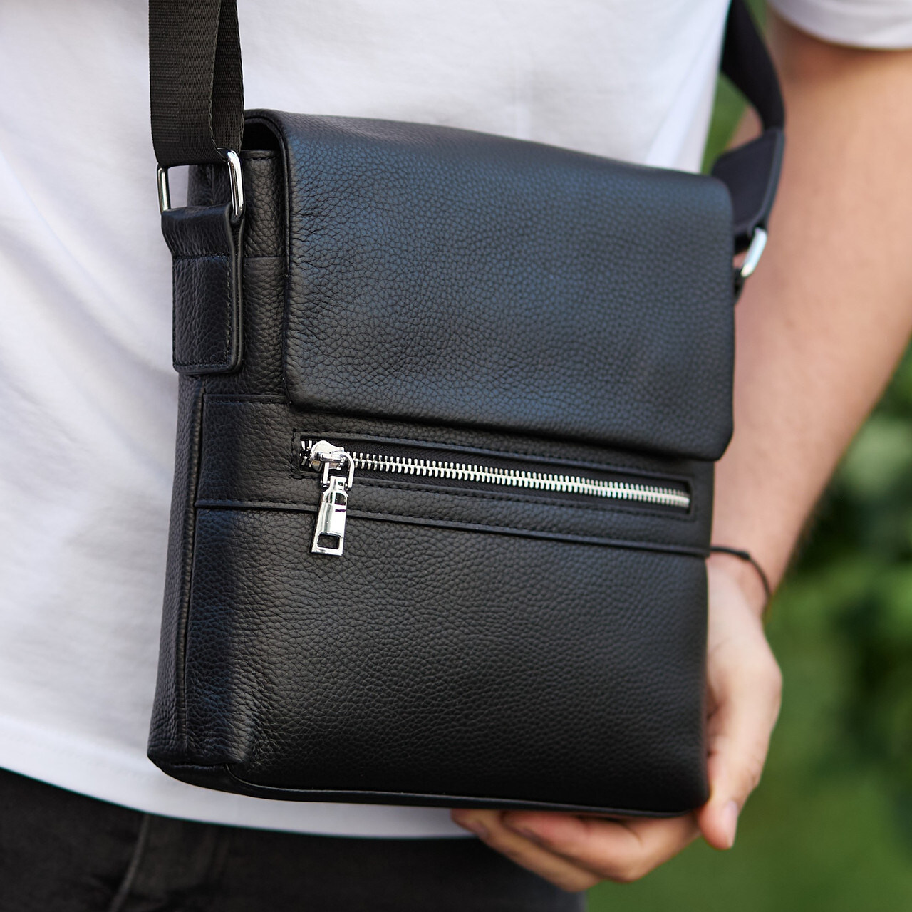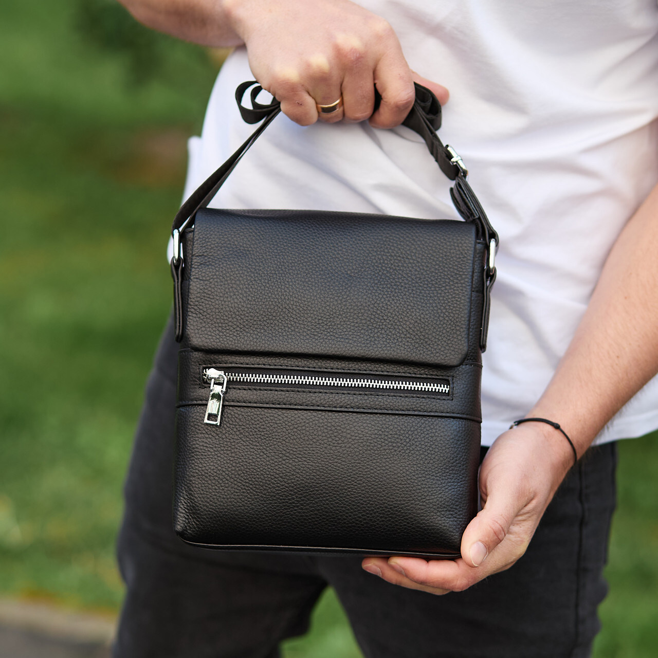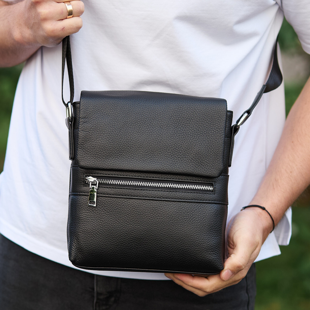 Чоловіча шкіряна сумка через плече (месенджер) є дуже потрібним і практичним аксесуаром для сучасного чоловіка. Ця сумка має стильний вигляд, якісно зроблена та гармонійно підійде до будь-якого стилю, а завдяки своїй формі зручна у використанні. Сумка закривається на перекидний клапан, під яким розміщено два основні відділення, що закриваються на змійці. Усередині сумки додатково є бічна кишеня на блискавці та дві відкриті кишені для дрібниць. Зовні під клапаном розміщена глибока відкрита кишеня та кишеня на блискавці. З тильного боку — врізна кишеня на блискавці. Підкладка сумки — текстиль. Колір фурнітури — срібло. Має текстильний регульований ремінь.