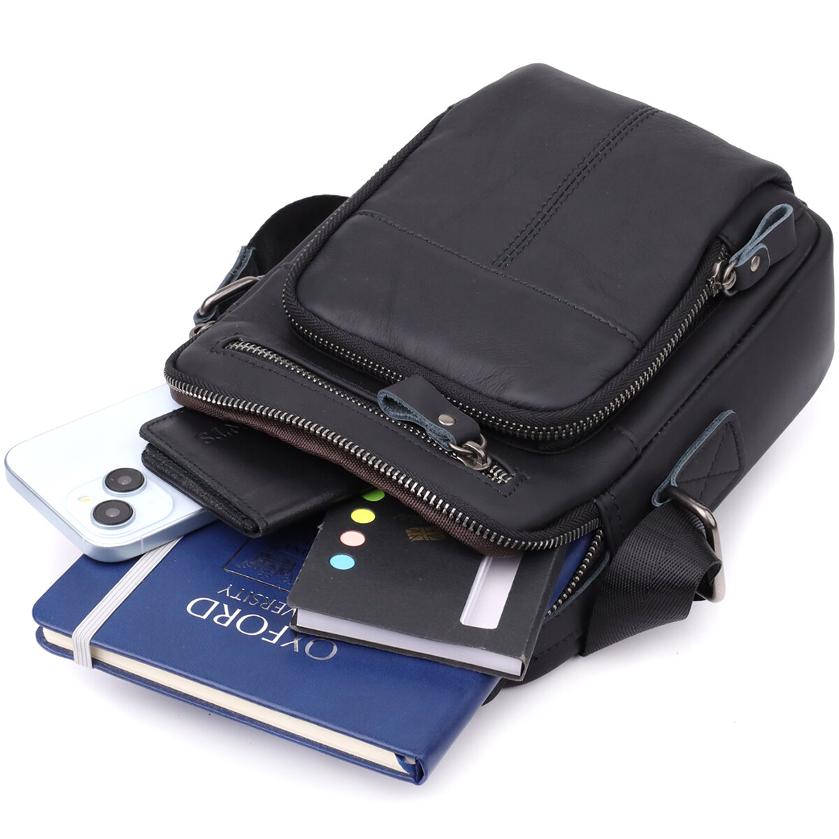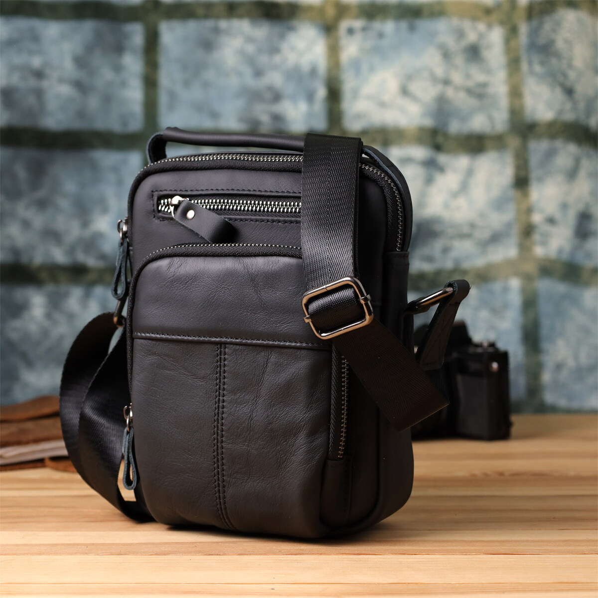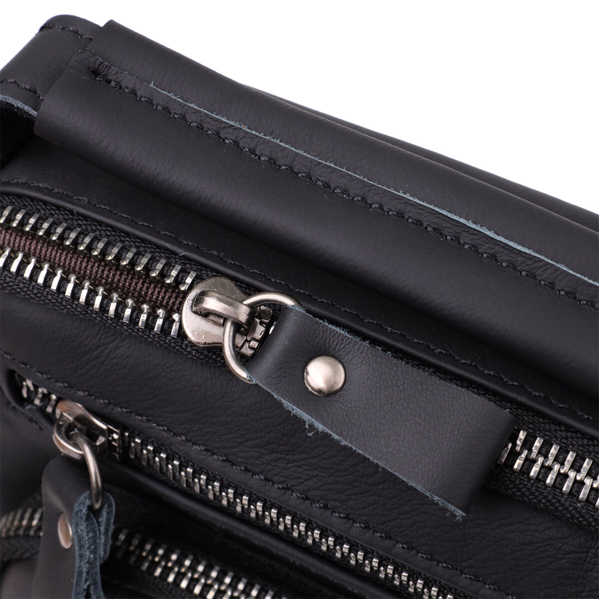 Чорна чоловіча сумка з матової натуральної шкіри - це практичний та стильний аксесуар, створений для тих, хто цінує зручність, стриману естетику та якість матеріалів. Завдяки універсальному дизайну сумка органічно впишеться в діловий гардероб, повсякденний образ або міський стиль. Вона стане надійним супутником протягом дня, дозволяючи завжди тримати необхідні речі під рукою і виглядати елегантно.