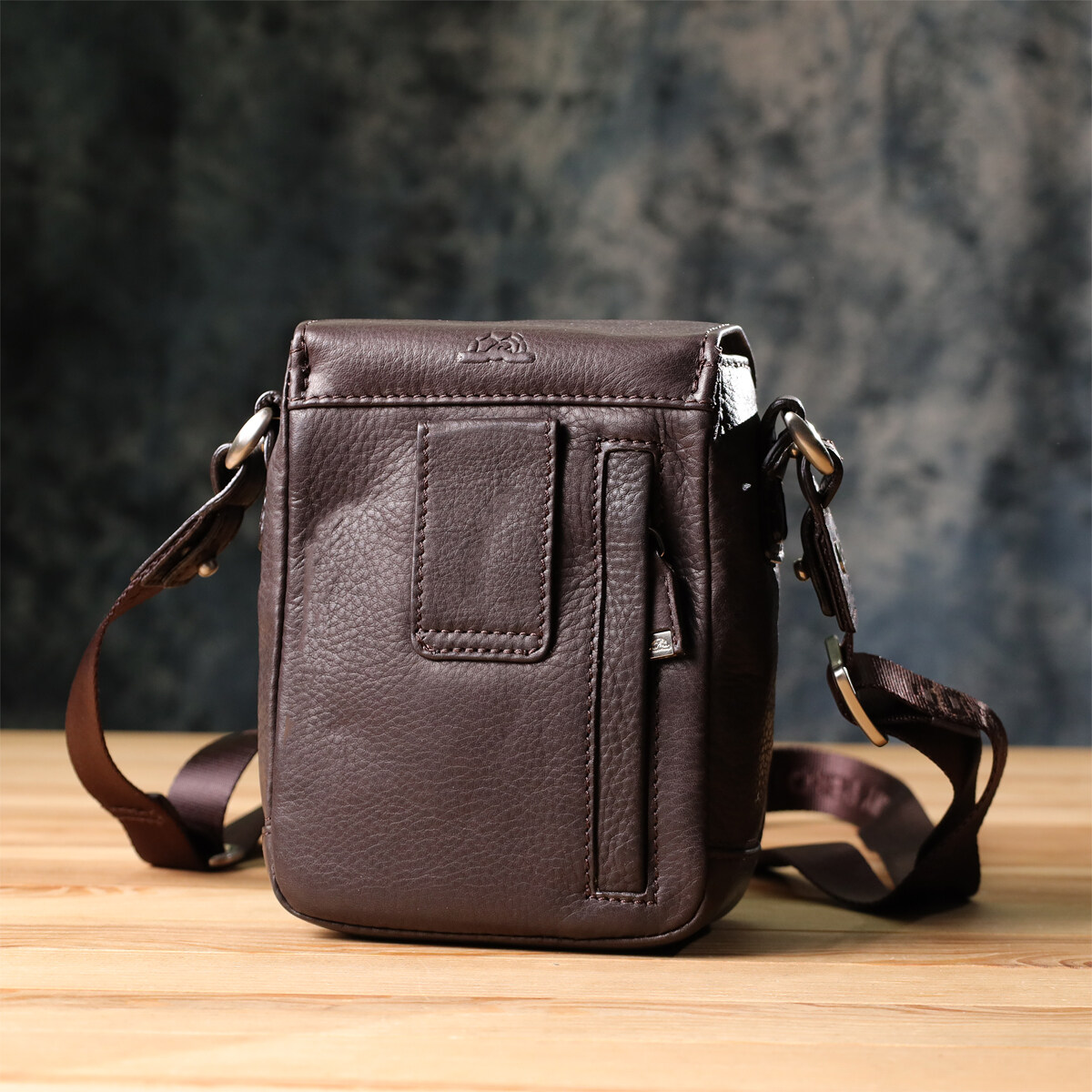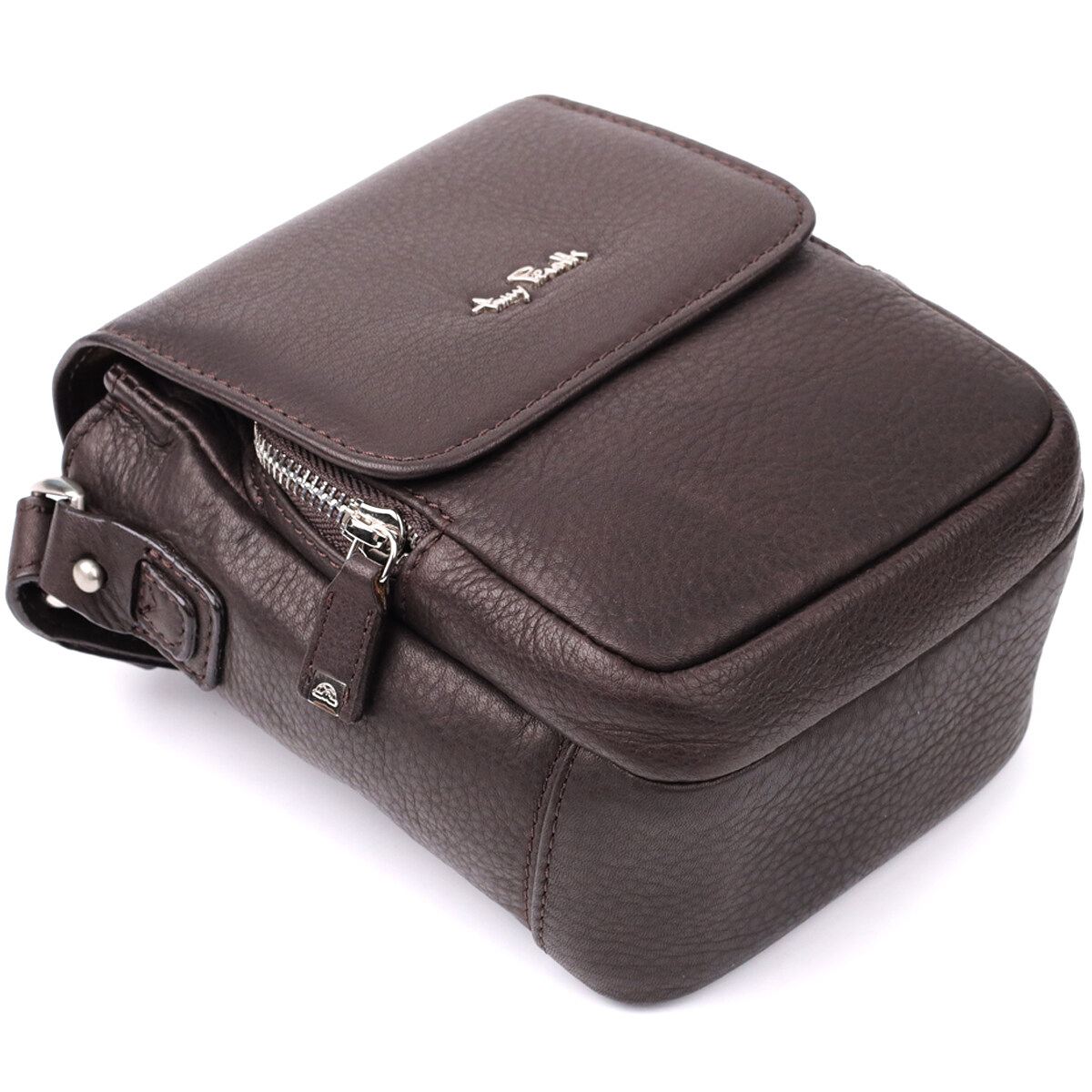 Сумка виготовлена з натуральної зернистої шкіри коричневого кольору. На лицьовій стороні розташований металевий логотип бренду, що підкреслює оригінальність та елегантність. Основне відділення закривається клапаном на магніт. Усередині передбачена відкрита кишеня, доповнена накладною кишенею на блискавці. На тильній стороні розташована вертикальна кишеня на блискавці. Сумка забезпечена брелком із двома металевими кільцями та незнімним брендованим текстильним ременем. Фурнітура виконана під срібло, що надає виробу сучасного та стриманого характеру.